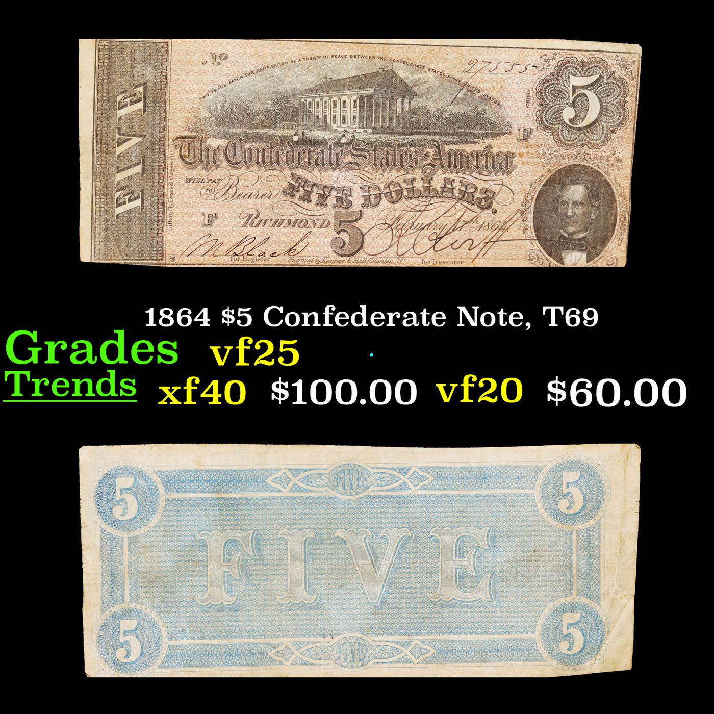 1864 $5 Confederate Note, T69 Grades vf+. From the seventh and last issue of Confederate currency, these bills were authorized in February 1864. When these $5 notes were issued over 150 years ago, each one was individually signed and numbered. This $5 Confederate note has a pink overprint and a picture of the Virginia State Capitol in the center. In the lower right corner of the note is a picture of C.G. Memminger. This note was printed on plain paper with pink and black ink on the front and blue ink on the back.