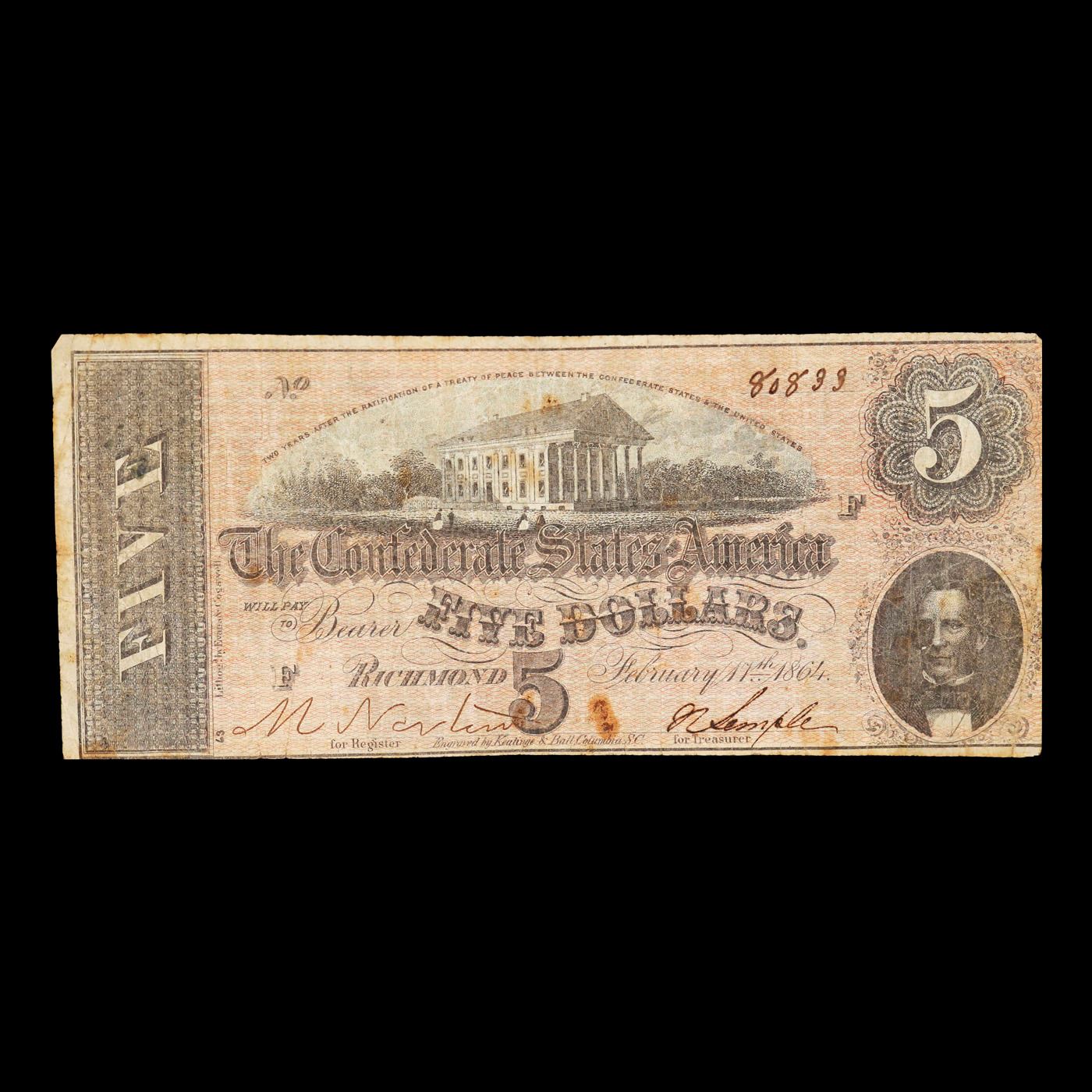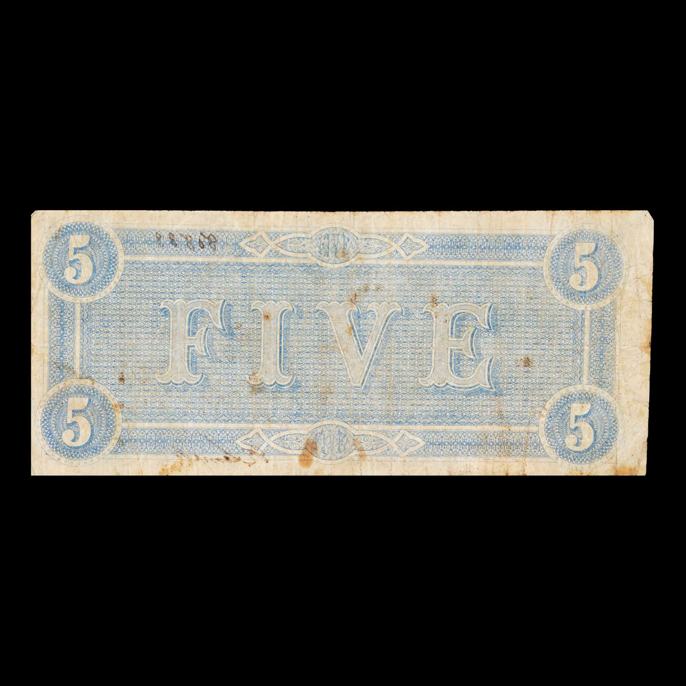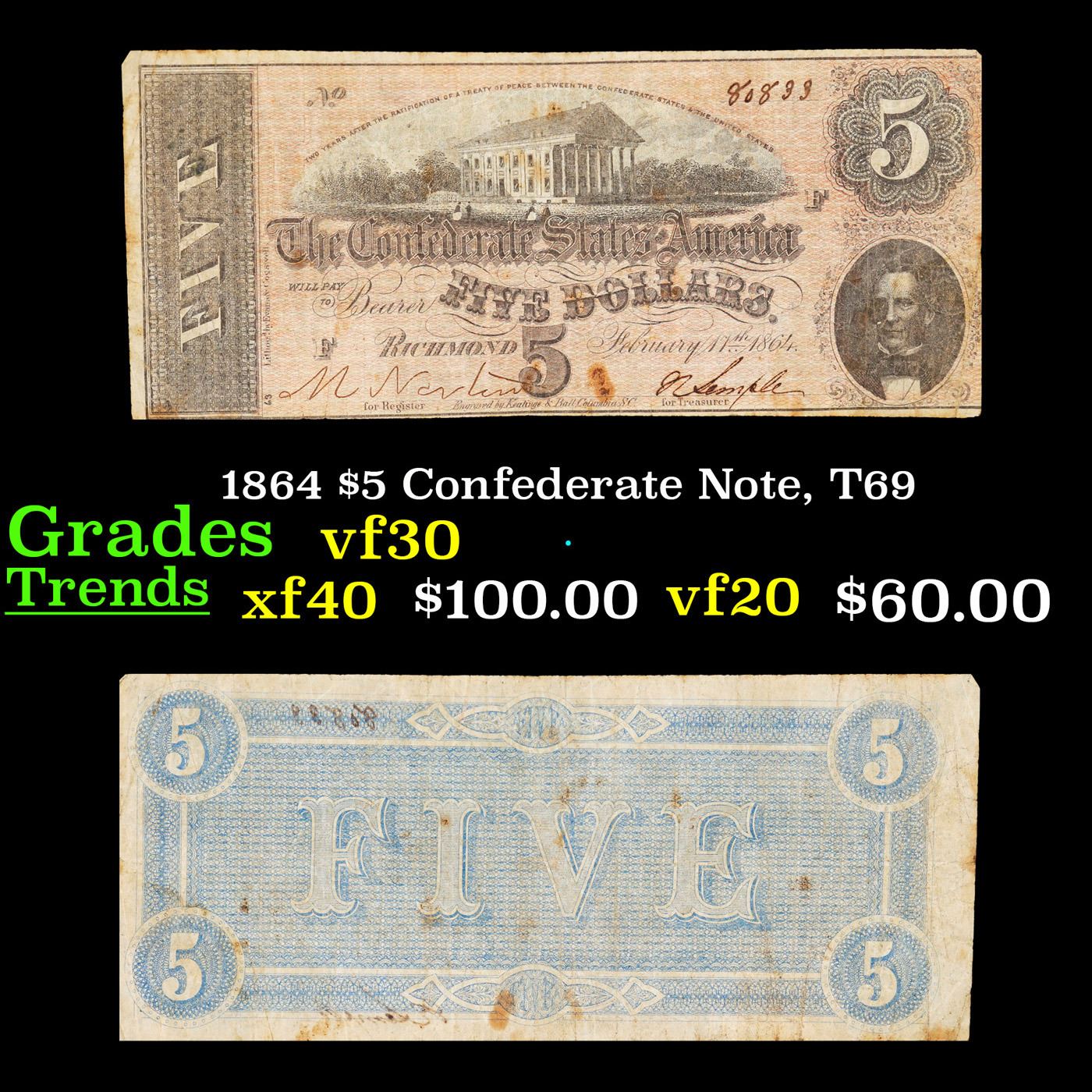 1864 $5 Confederate Note, T69 Grades vf++. From the seventh and last issue of Confederate currency, these bills were authorized in February 1864. When these $5 notes were issued over 150 years ago, each one was individually signed and numbered. This $5 Confederate note has a pink overprint and a picture of the Virginia State Capitol in the center. In the lower right corner of the note is a picture of C.G. Memminger. This note was printed on plain paper with pink and black ink on the front and blue ink on the back.