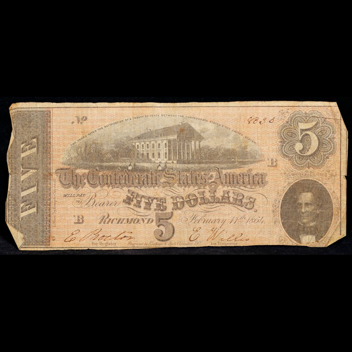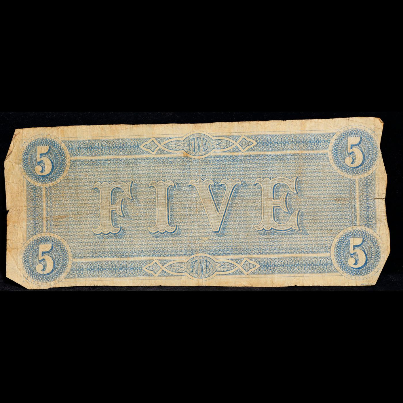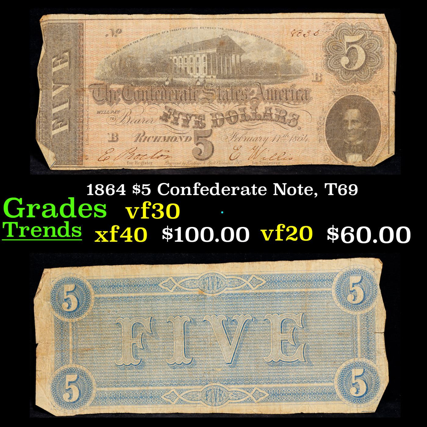 1864 $5 Confederate Note, T69 Grades vf++. From the seventh and last issue of Confederate currency, these bills were authorized in February 1864. When these $5 notes were issued over 150 years ago, each one was individually signed and numbered. This $5 Confederate note has a pink overprint and a picture of the Virginia State Capitol in the center. In the lower right corner of the note is a picture of C.G. Memminger. This note was printed on plain paper with pink and black ink on the front and blue ink on the back.