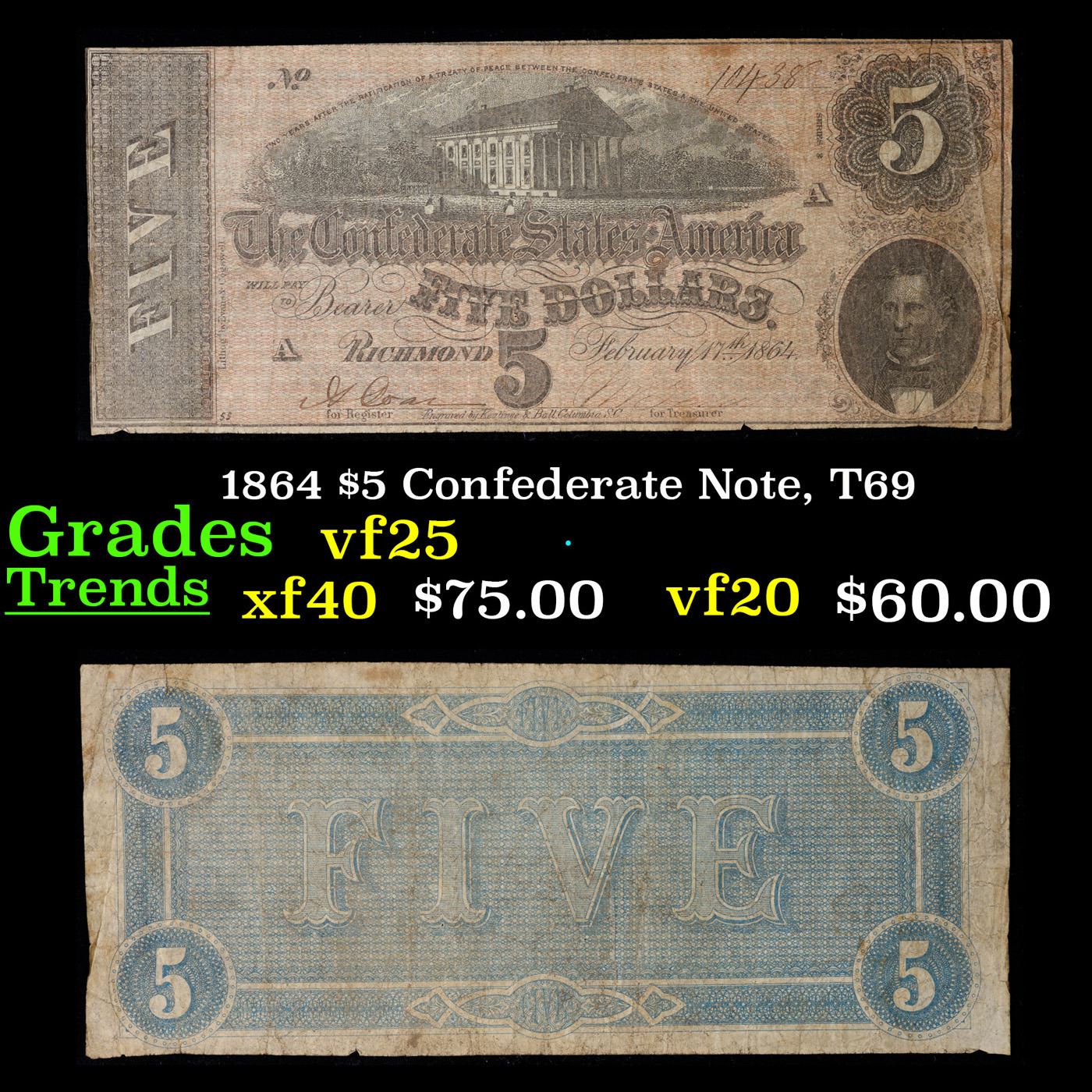 1864 $5 Confederate Note, T69 Grades vf+