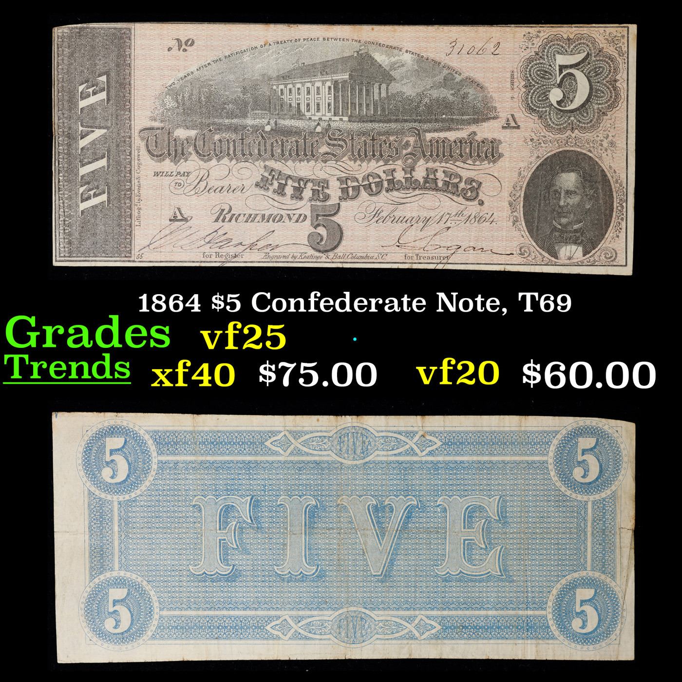 1864 $5 Confederate Note, T69 Grades vf+. From the seventh and last issue of Confederate currency, these bills were authorized in February 1864. When these $5 notes were issued over 150 years ago, each one was individually signed and numbered. This $5 Confederate note has a pink overprint and a picture of the Virginia State Capitol in the center. In the lower right corner of the note is a picture of C.G. Memminger. This note was printed on plain paper with pink and black ink on the front and blue ink on the back.