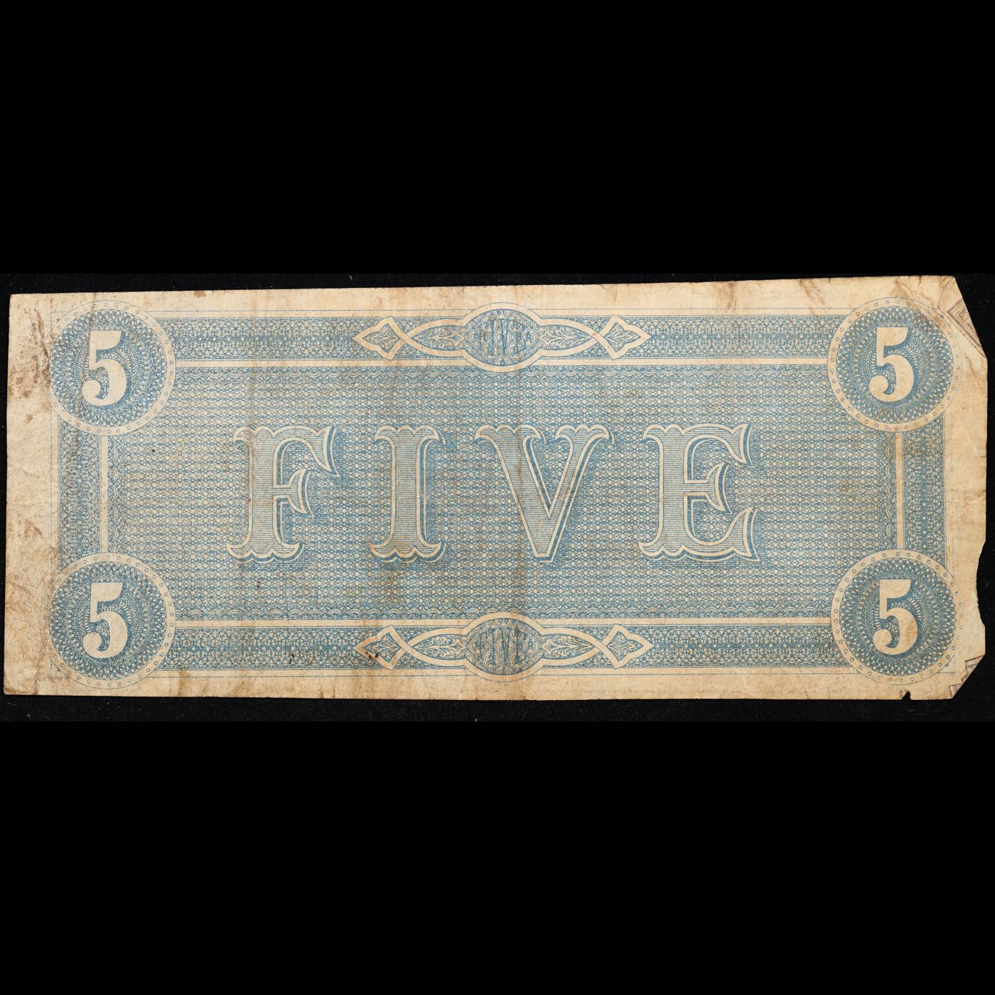 1864 $5 Confederate Note, T69 Grades vf+. From the seventh and last issue of Confederate currency, these bills were authorized in February 1864. When these $5 notes were issued over 150 years ago, each one was individually signed and numbered. This $5 Confederate note has a pink overprint and a picture of the Virginia State Capitol in the center. In the lower right corner of the note is a picture of C.G. Memminger. This note was printed on plain paper with pink and black ink on the front and blue ink on the back.