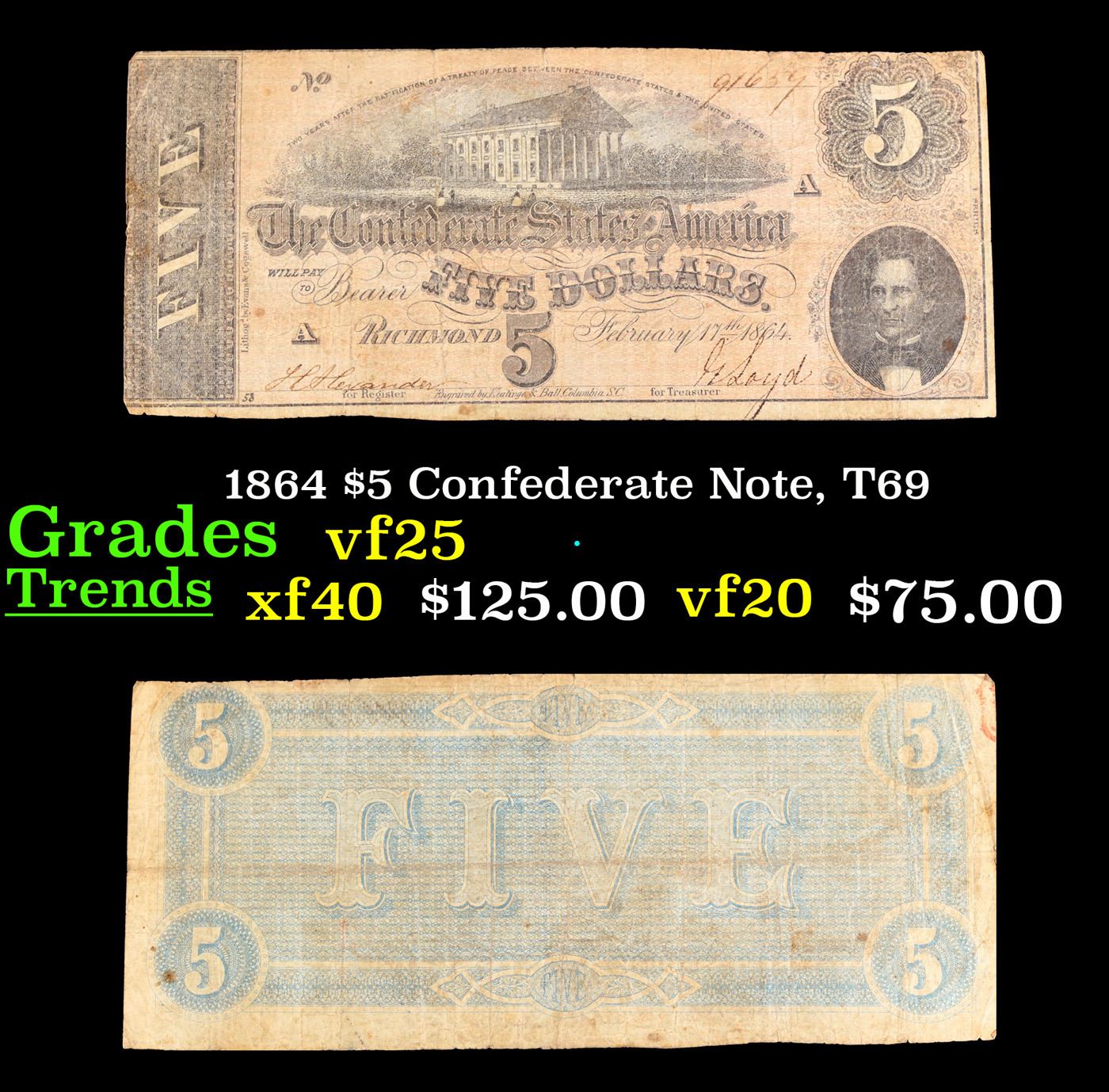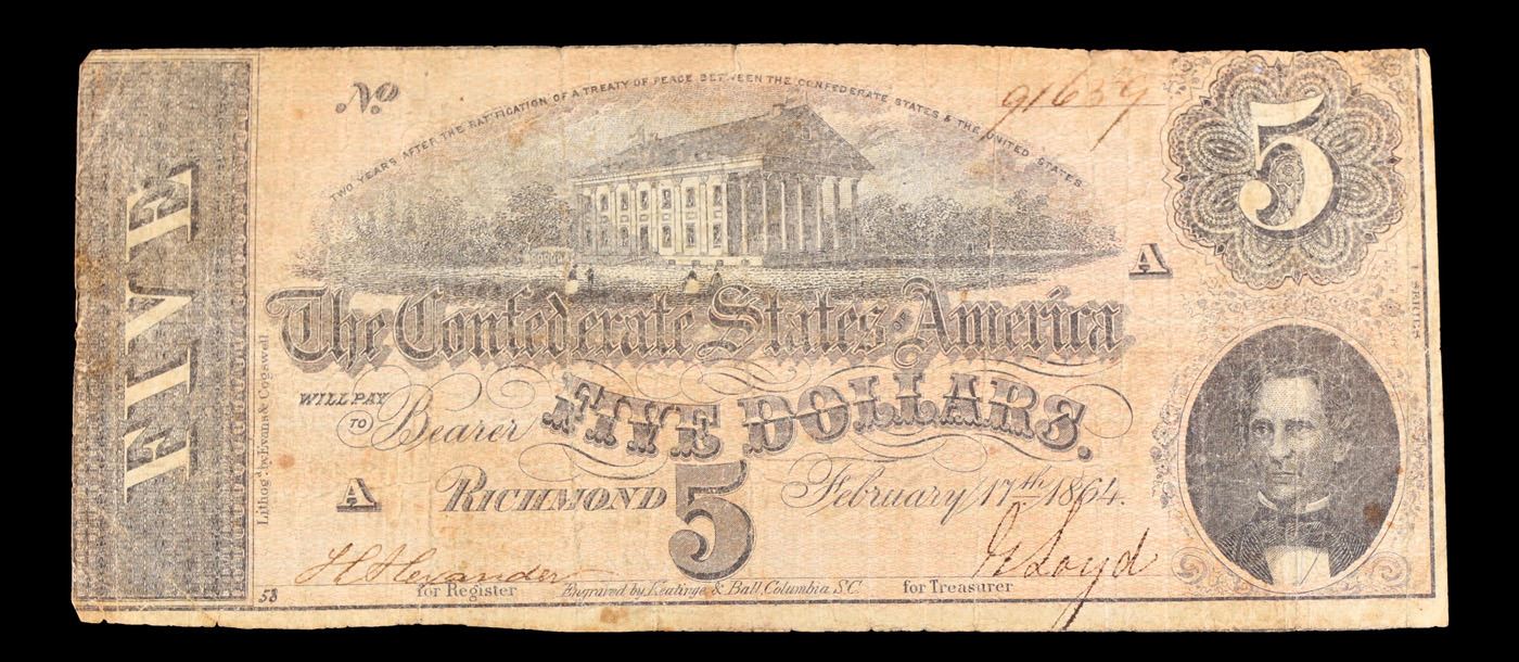 1864 $5 Confederate Note, T69 Grades vf+. From the seventh and last issue of Confederate currency, these bills were authorized in February 1864. When these $5 notes were issued over 150 years ago, each one was individually signed and numbered. This $5 Confederate note has a pink overprint and a picture of the Virginia State Capitol in the center. In the lower right corner of the note is a picture of C.G. Memminger. This note was printed on plain paper with pink and black ink on the front and blue ink on the back.