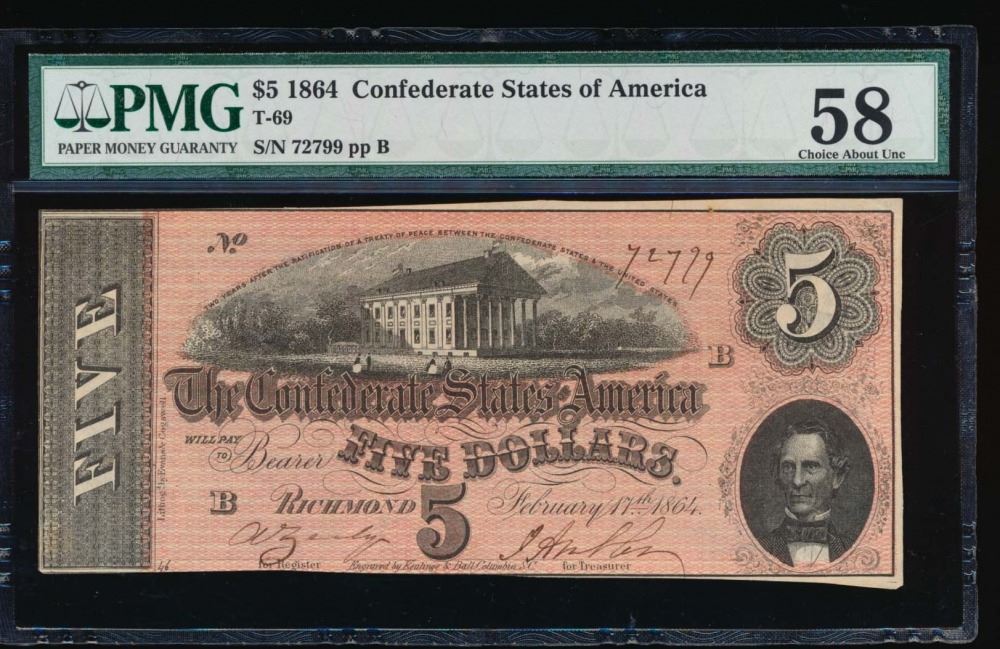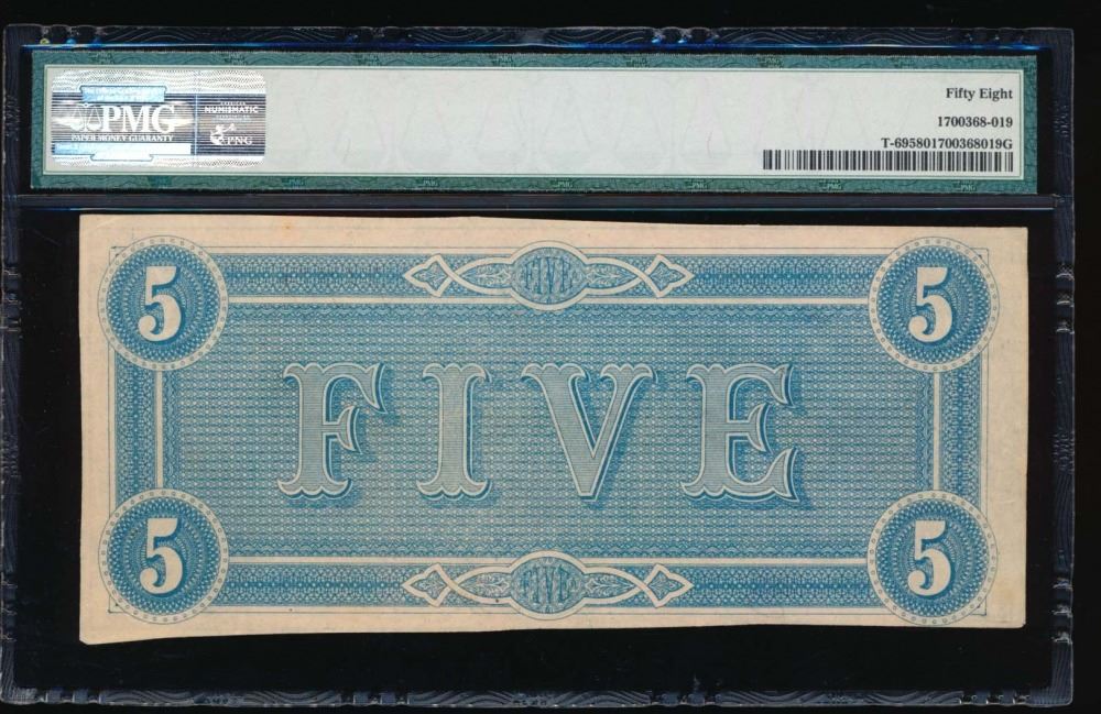 One 1864 $5 Confederate State of American Note PMG 58.