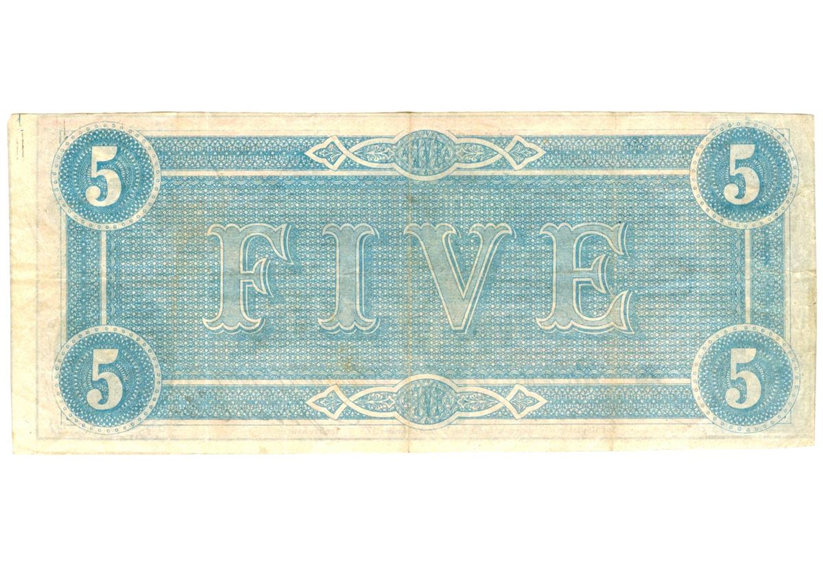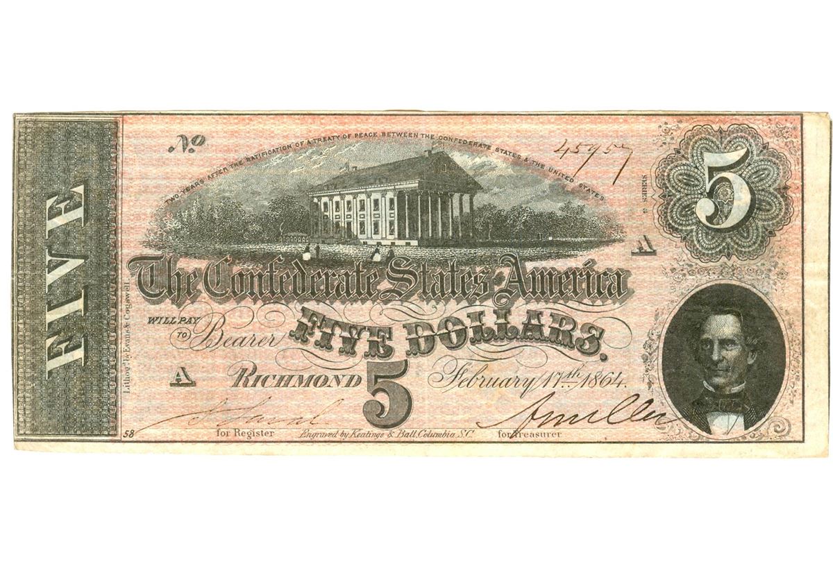 One 1864 $5 Confederate States of America Bank Note. Origin: Richmond, Virginia.