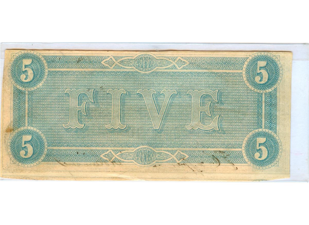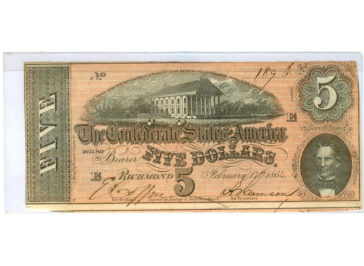 One 1864 $5 Confederate States of America Bank Note. Origin: Richmond, Virginia.
