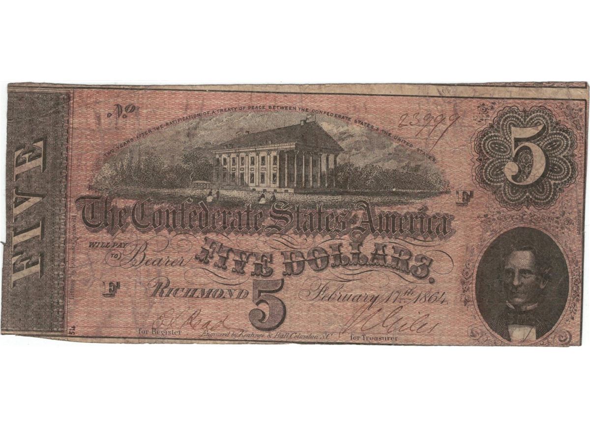 1864 $5 Confederate States of America Bank Note.