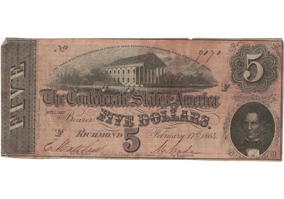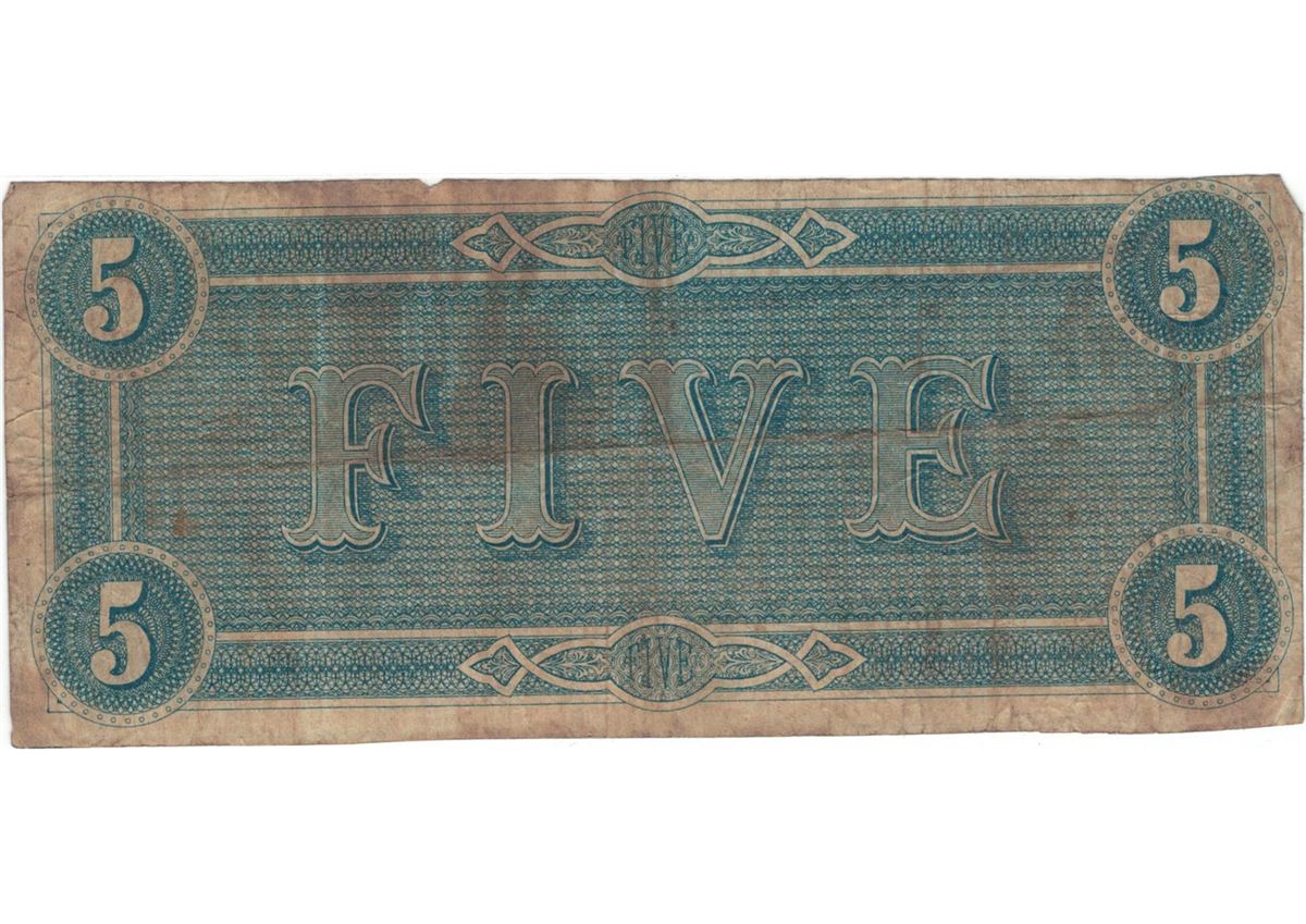 1864 $5 Confederate States of America Bank Note.