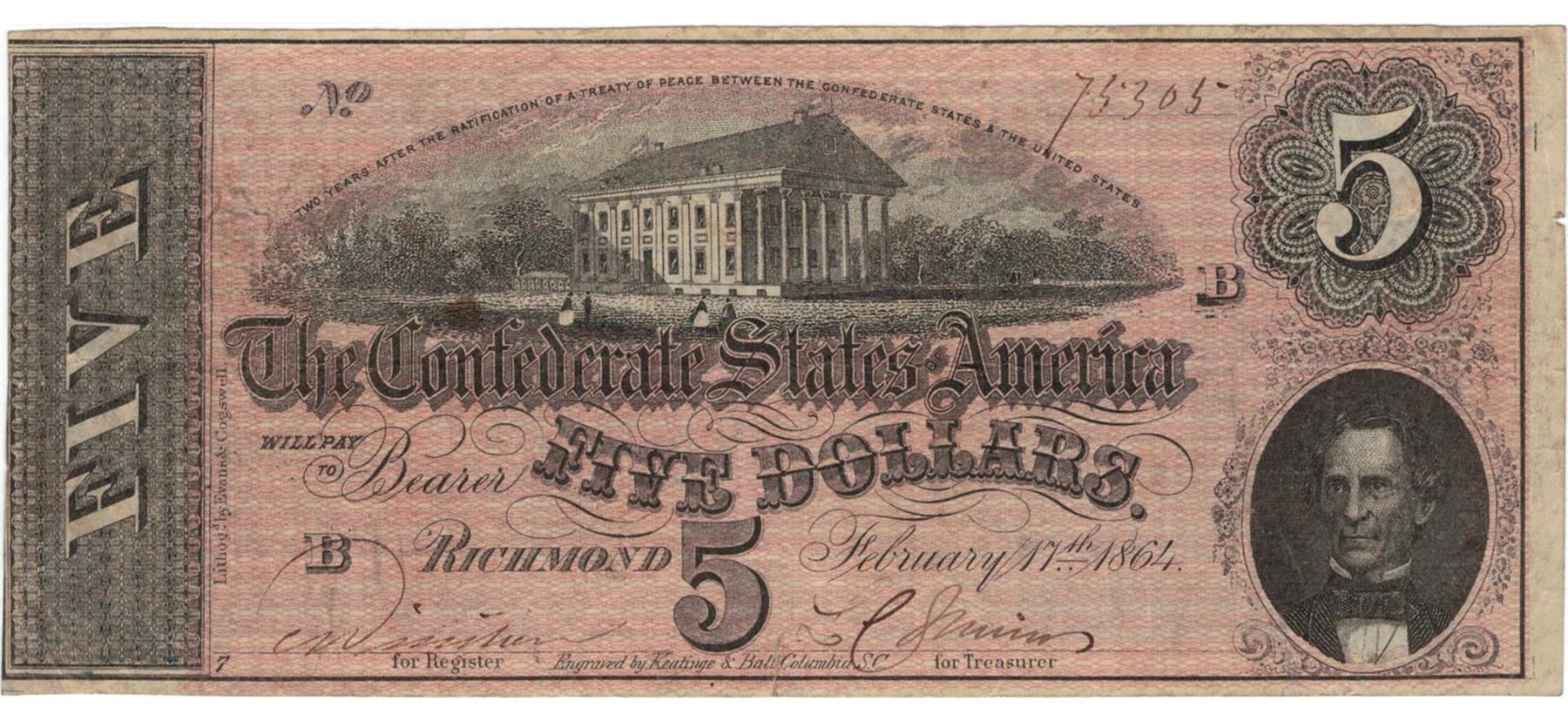 1864 $5 Confederate States of America Bank Note.