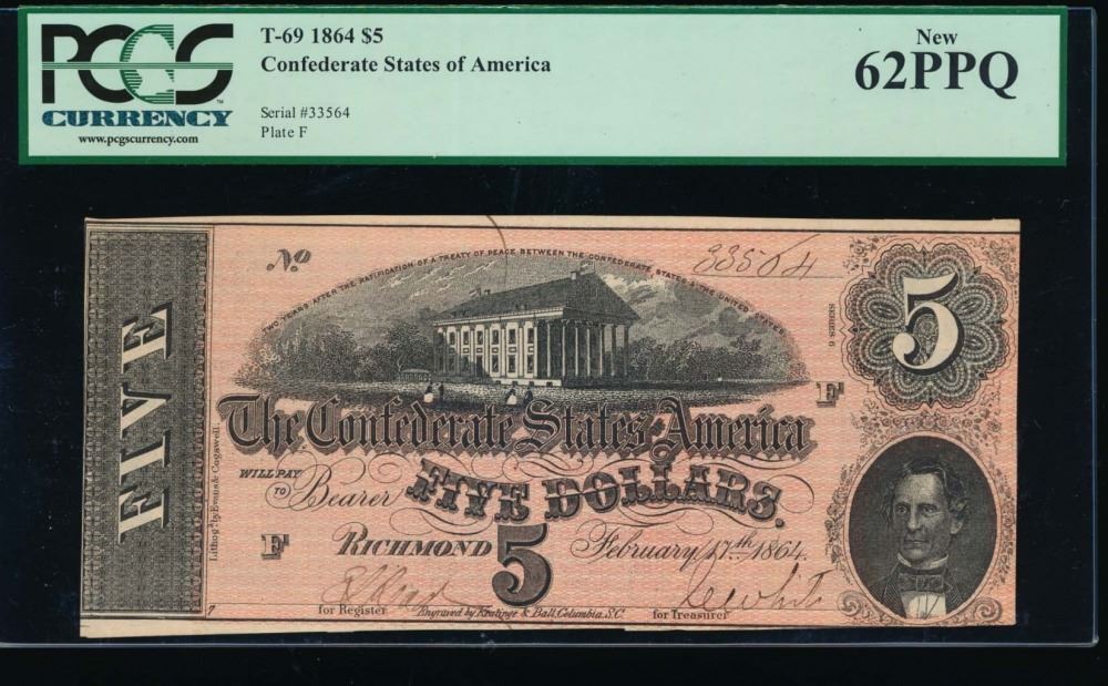 One 1864 $5 Confederate States of America Note PCGS 62PPQ.