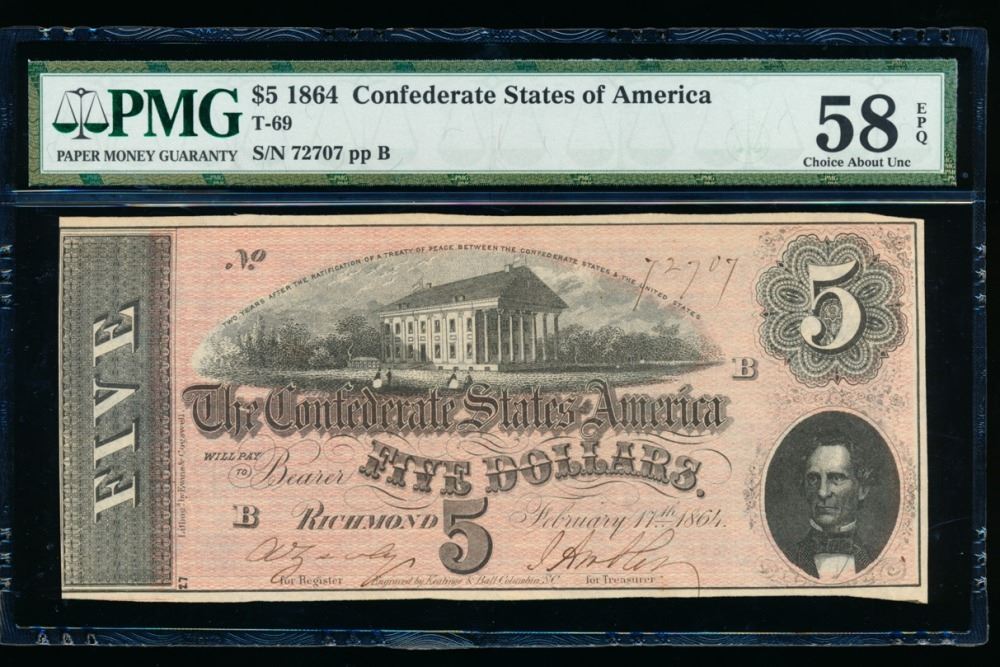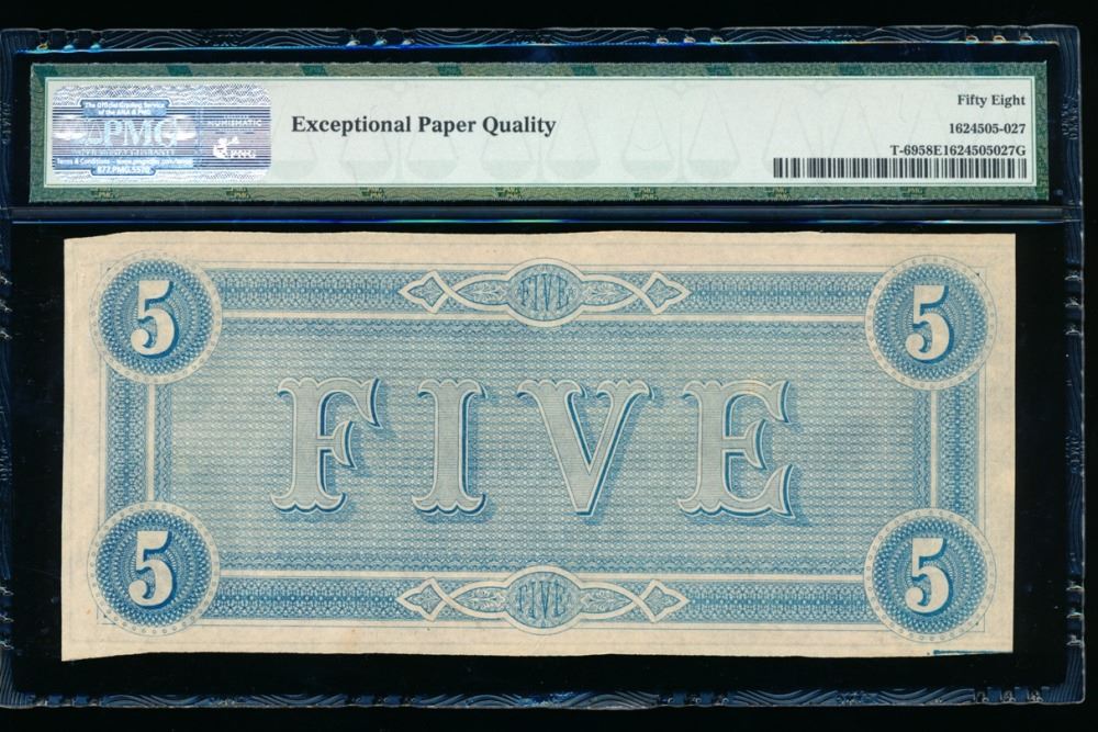 One 1864 $5 Confederate States of America Note PMG 58EPQ.