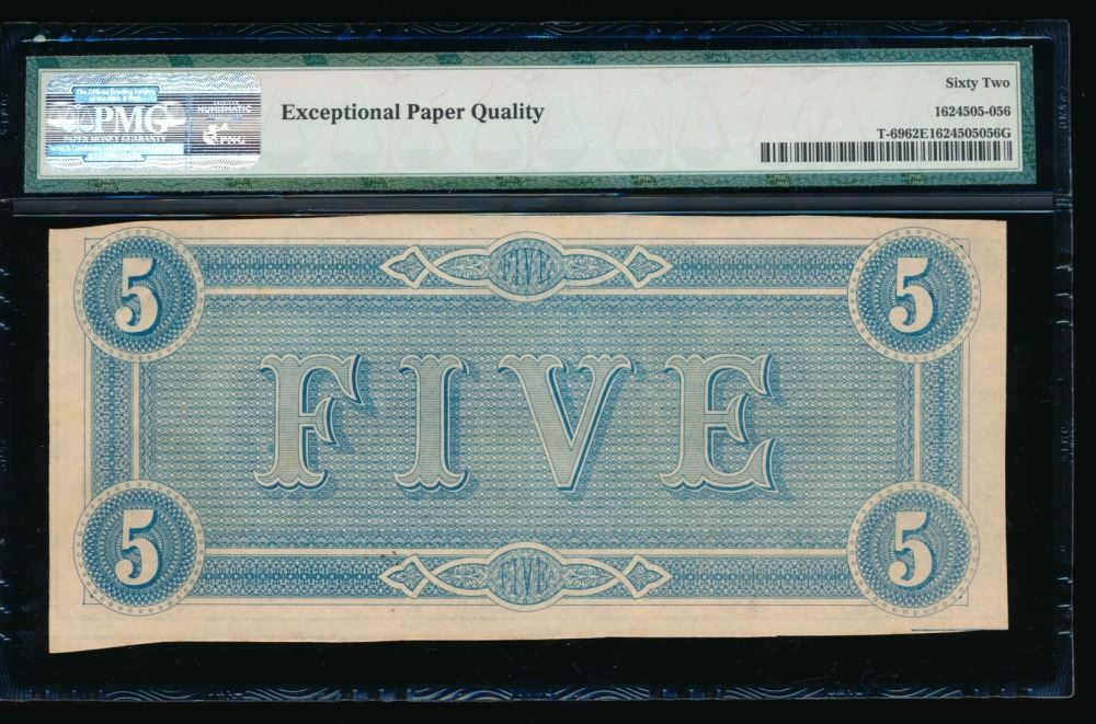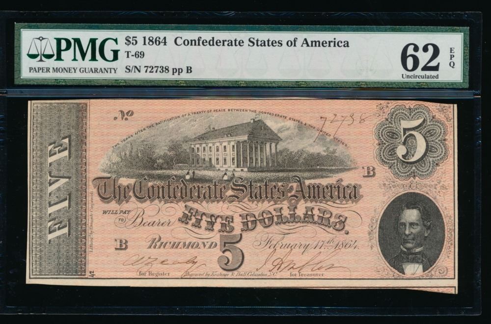 One 1864 $5 Confederate States of America Note PMG 62EPQ.