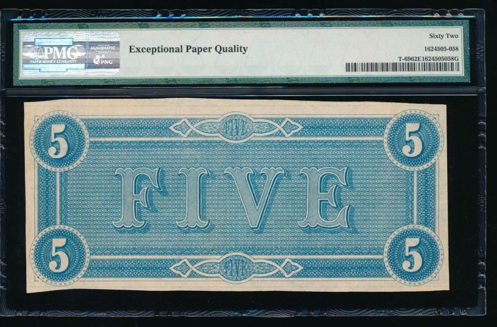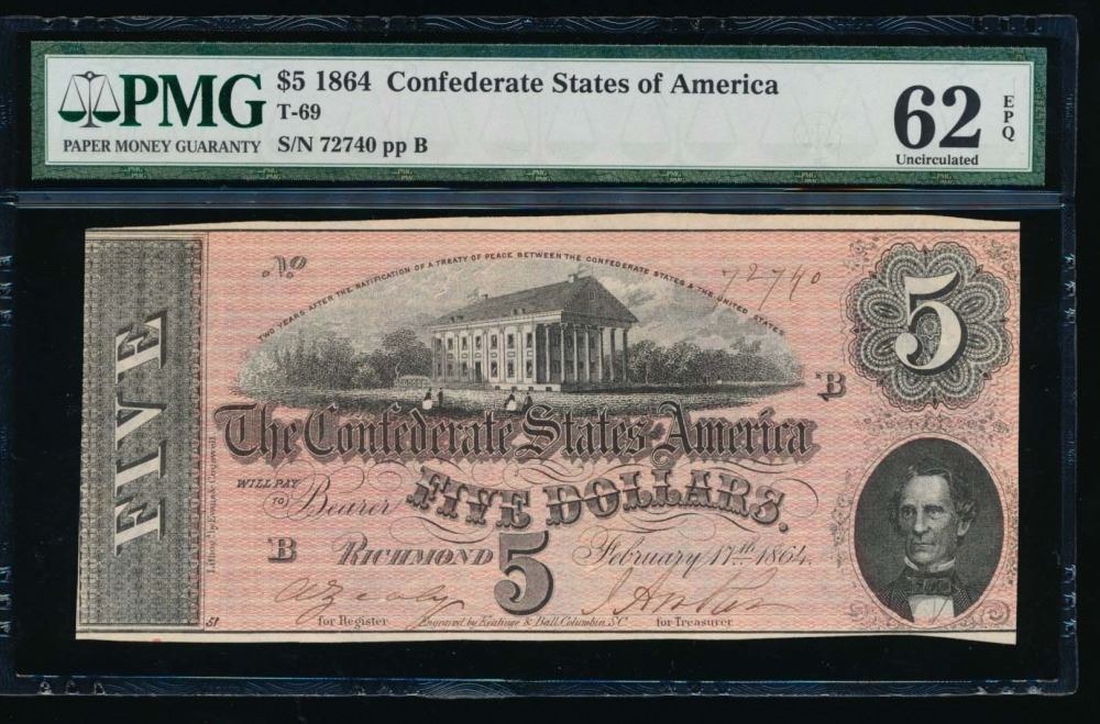 One 1864 $5 Confederate States of America Note PMG 62EPQ.