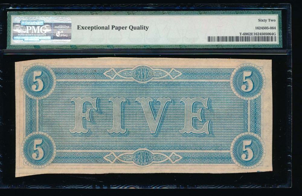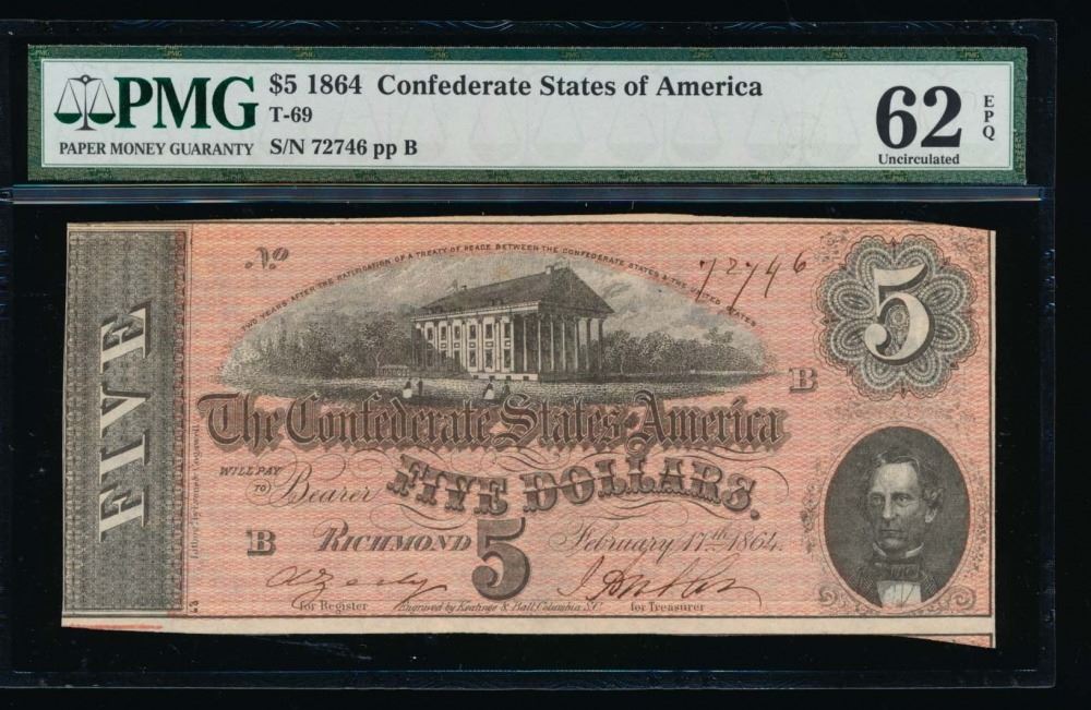 One 1864 $5 Confederate States of America Note PMG 62EPQ.