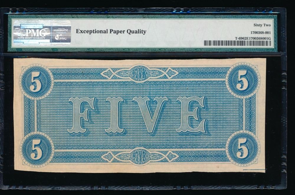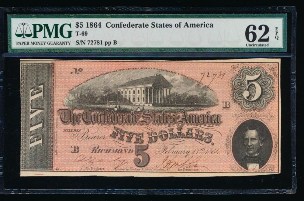 One 1864 $5 Confederate States of America Note PMG 62EPQ.