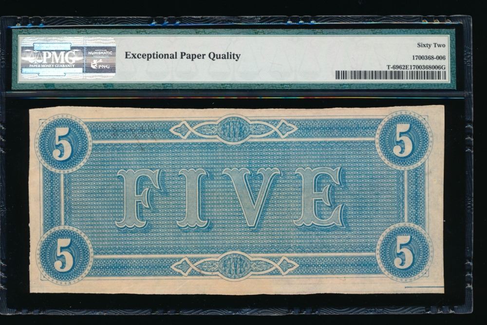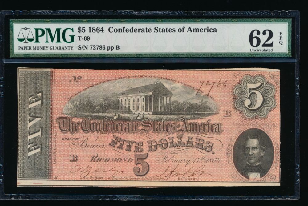 One 1864 $5 Confederate States of America Note PMG 62EPQ.