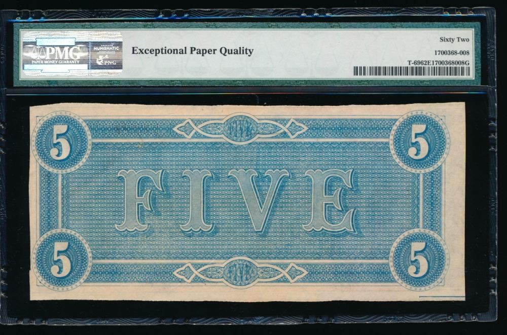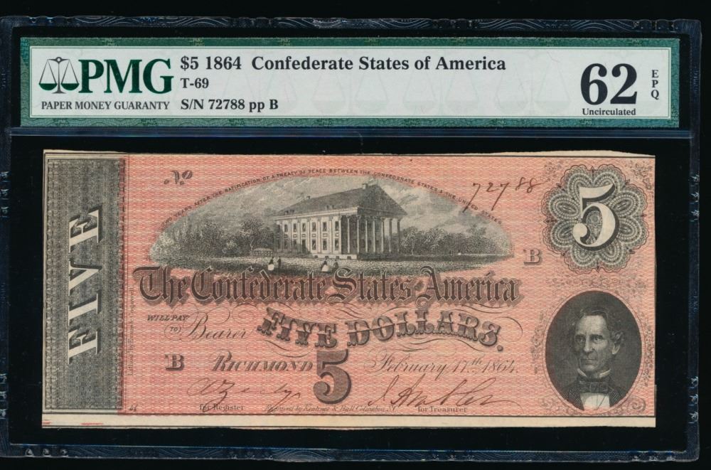 One 1864 $5 Confederate States of America Note PMG 62EPQ.