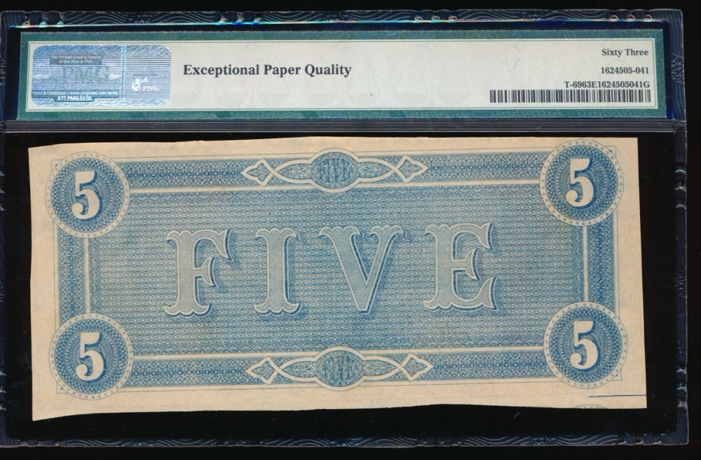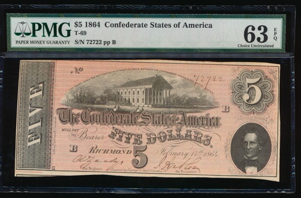 One 1864 $5 Confederate States of America Note PMG 63EPQ.