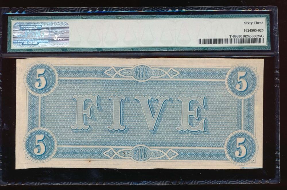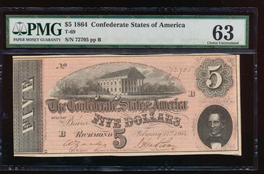 One 1864 $5 Confederate States of America Note PMG 63EPQ.