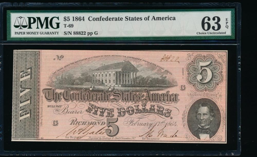 One 1864 $5 Confederate States of America Note PMG 63EPQ.