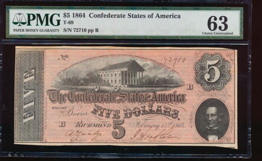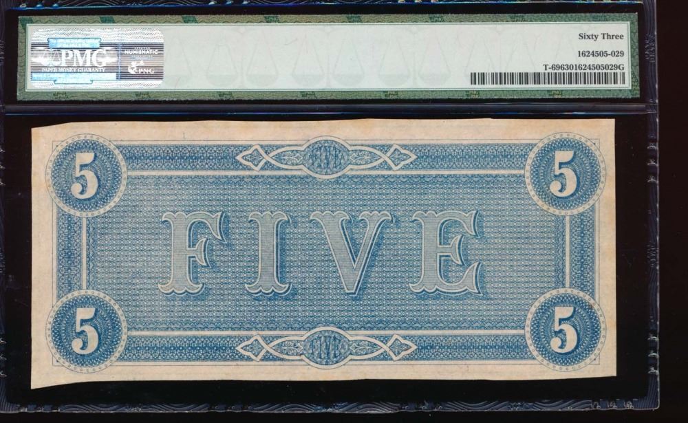 One 1864 $5 Confederate States of America Note PMG 63.