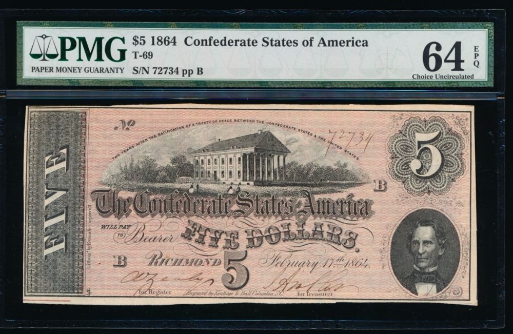 One 1864 $5 Confederate States of America Note PMG 64EPQ.