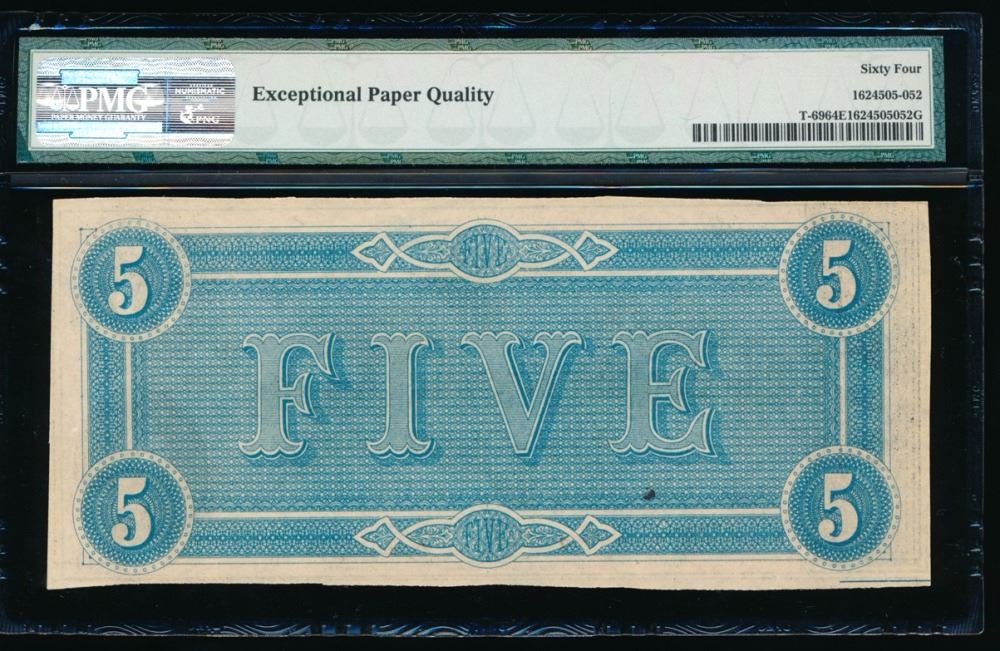 One 1864 $5 Confederate States of America Note PMG 64EPQ.