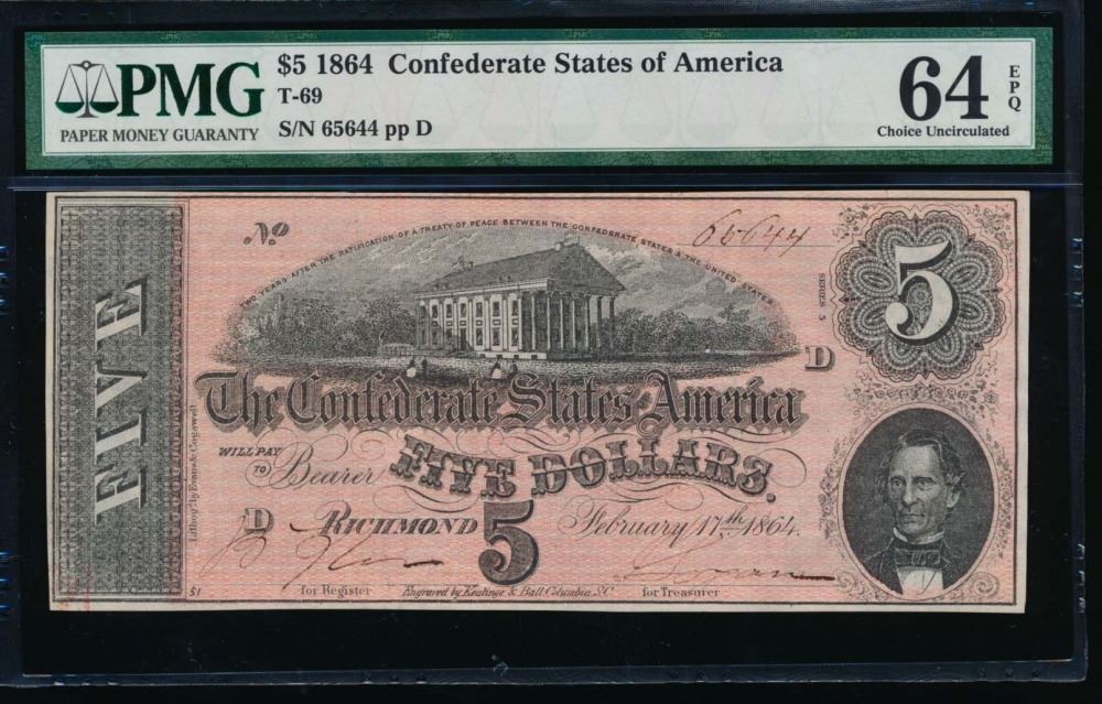 One 1864 $5 Confederate States of America Note PMG 64EPQ.