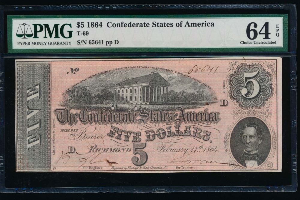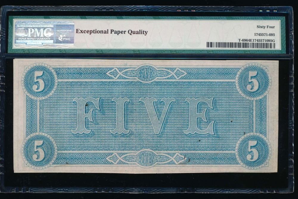 One 1864 $5 Confederate States of America Note PMG 64EPQ.