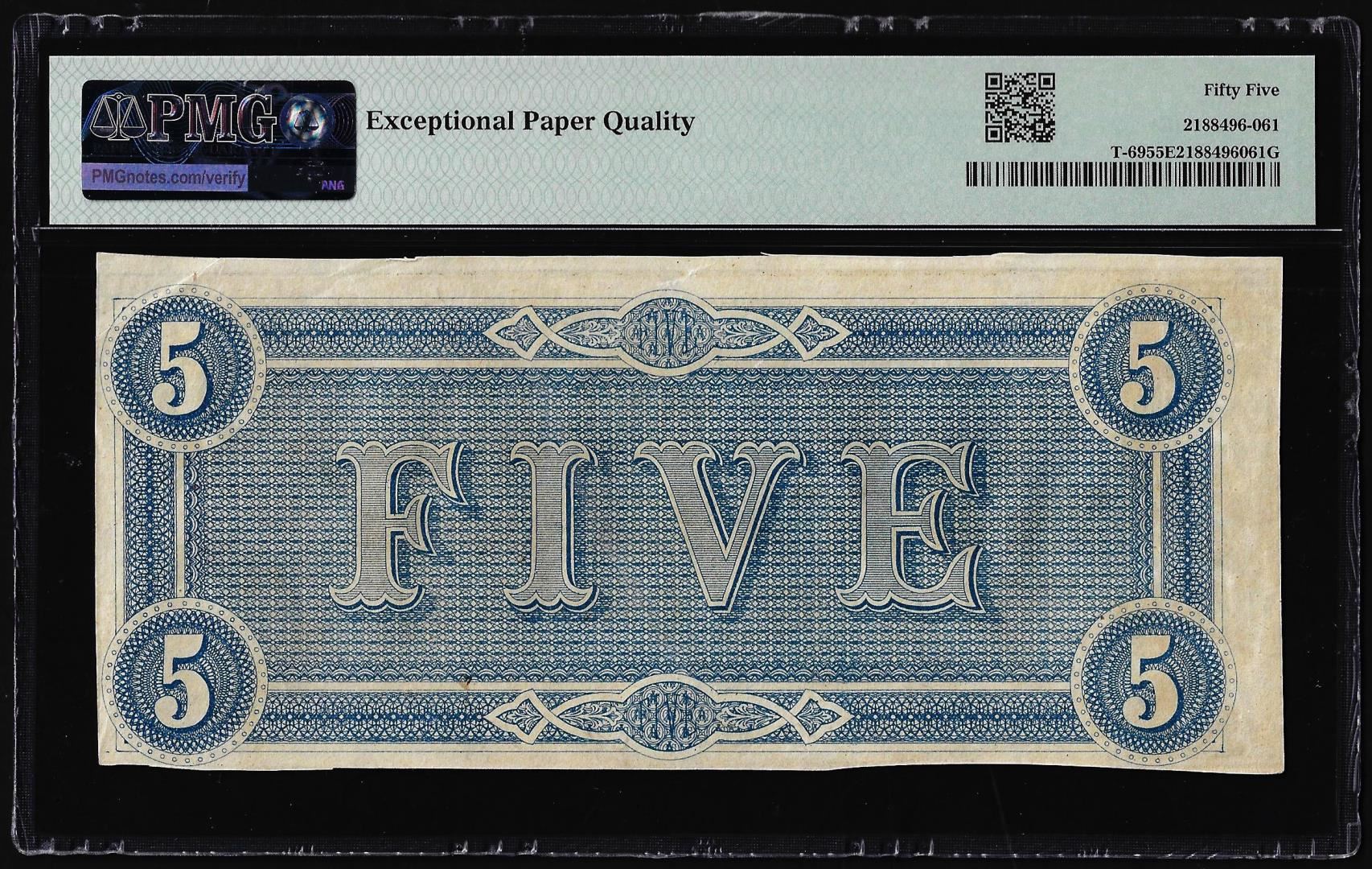 1864 $5 Confederate States of America Note T-69 PMG About Uncirculated 55EPQ
