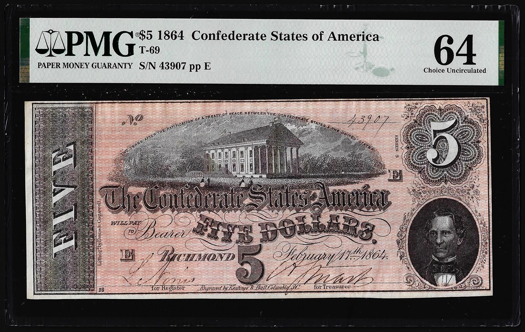 One 1864 $5 Confederate States of America Note T-69 PMG Choice Uncirculated 64. PMG Certified.