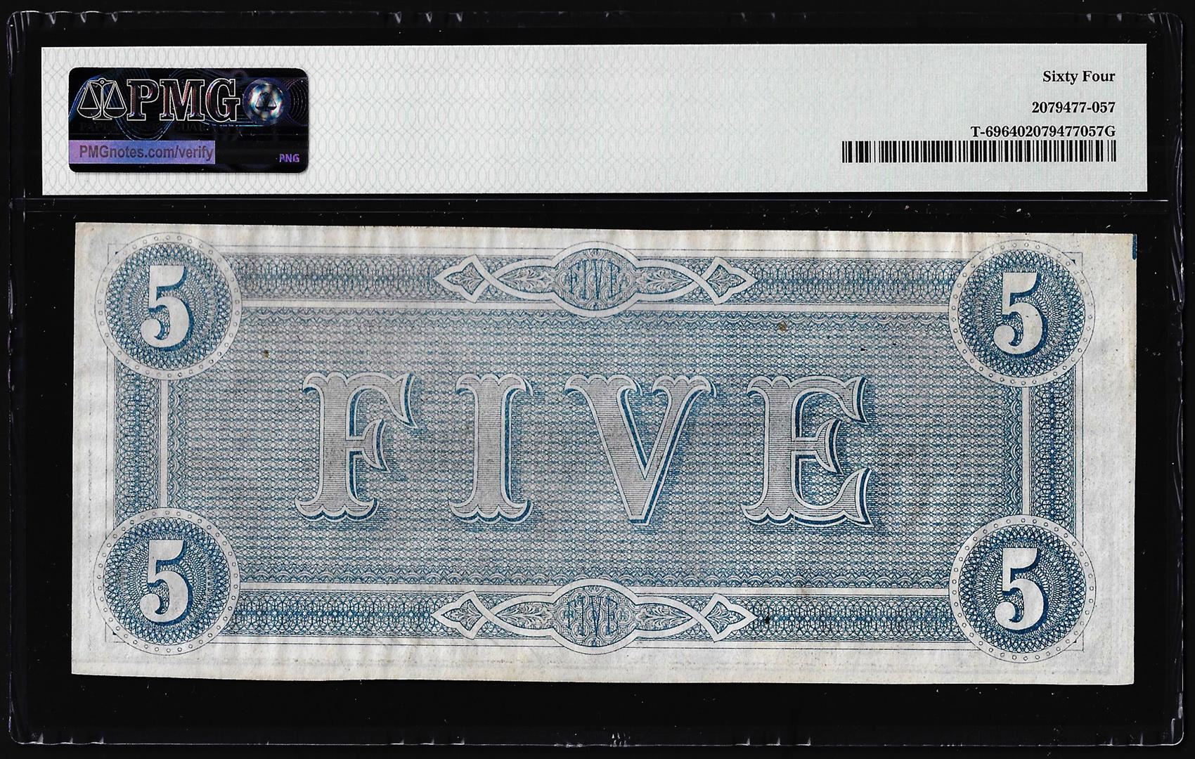 1864 $5 Confederate States of America Note T-69 PMG Choice Uncirculated 64