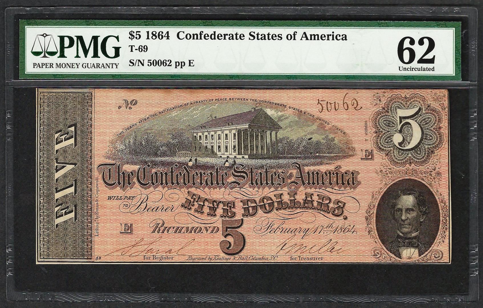 One 1864 $5 Confederate States of America Note T-69 PMG Uncirculated 62. PMG Certified.