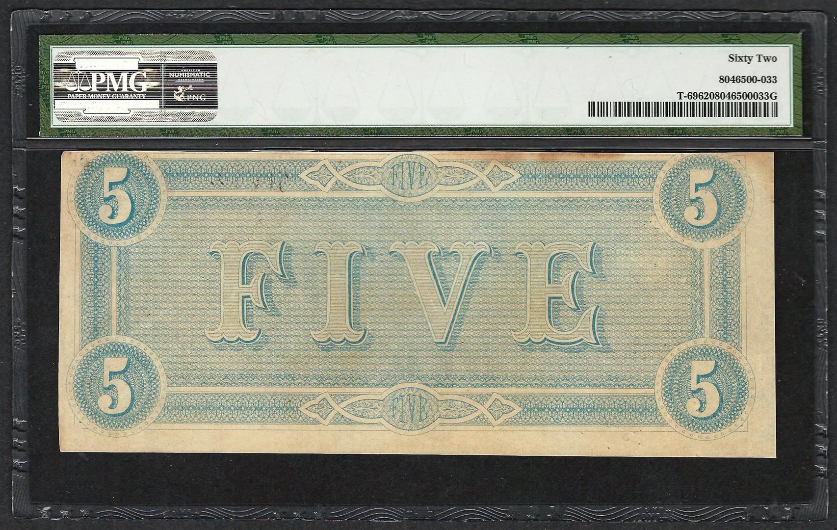 1864 $5 Confederate States of America Note T-69 PMG Uncirculated 62