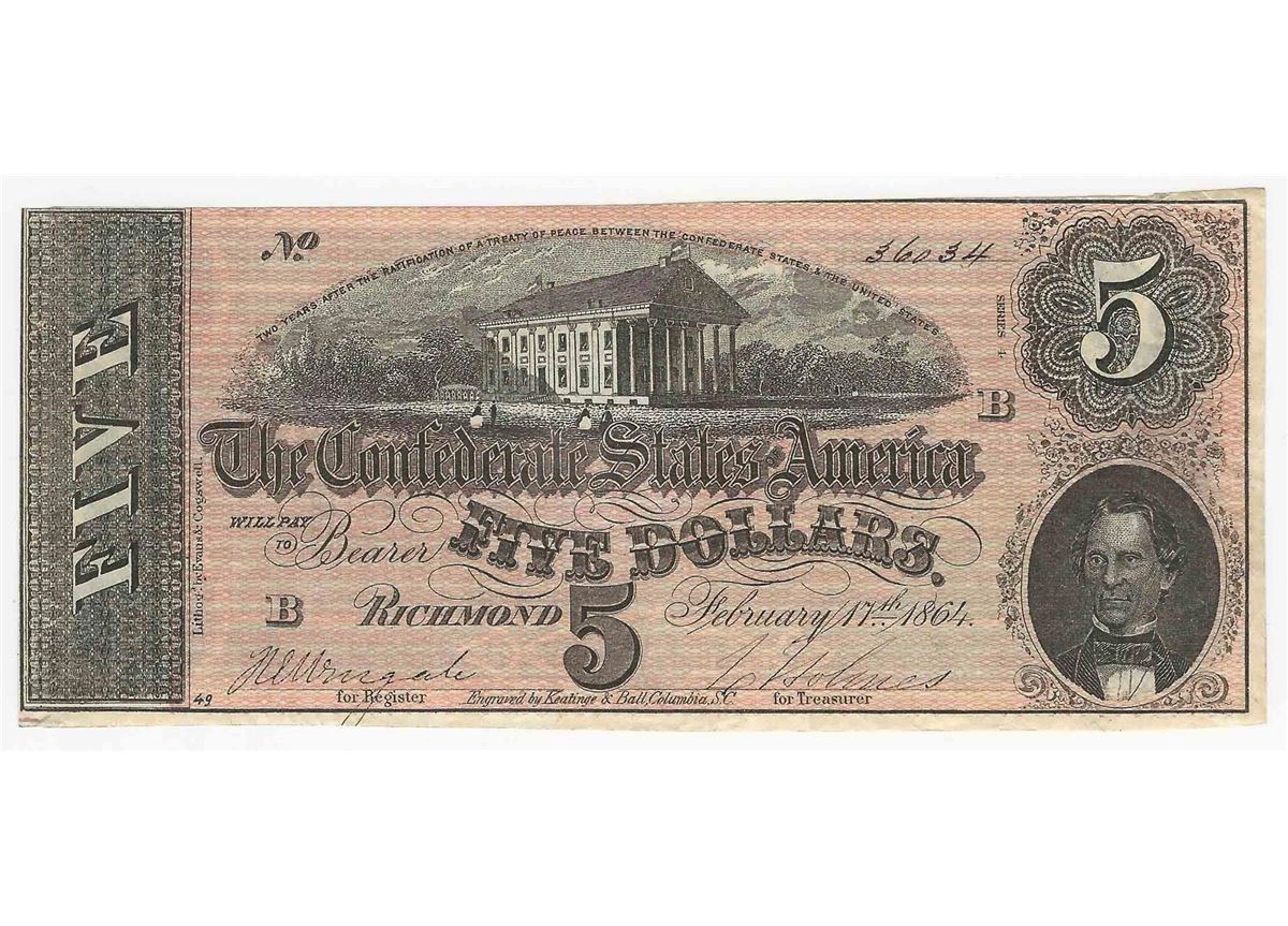 One 1864 $5 Confederate States of America Note.