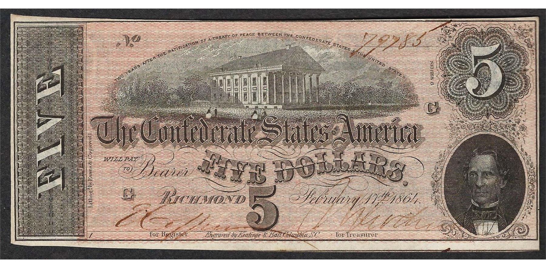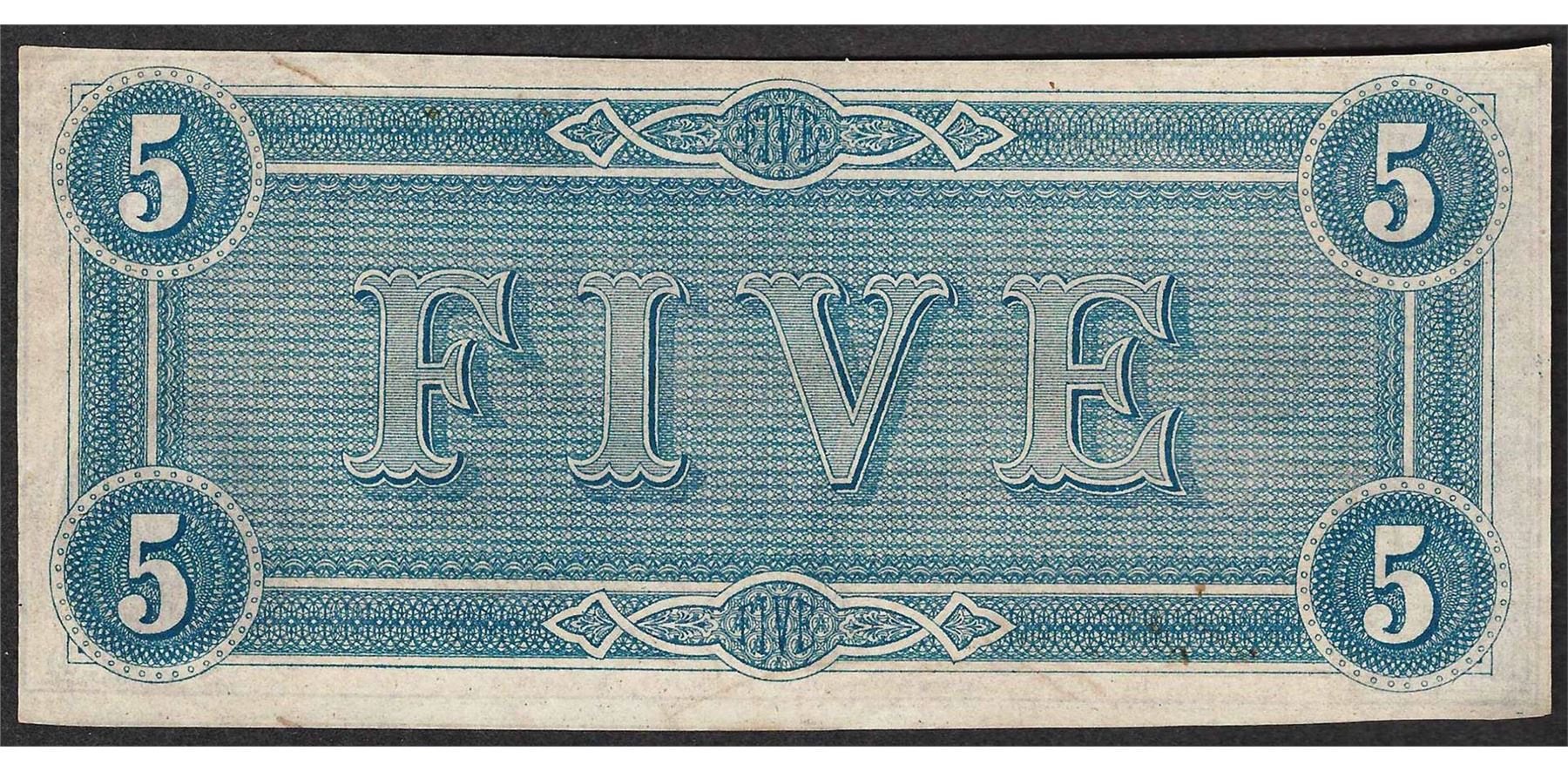 One 1864 $5 Confederate States of America Note.