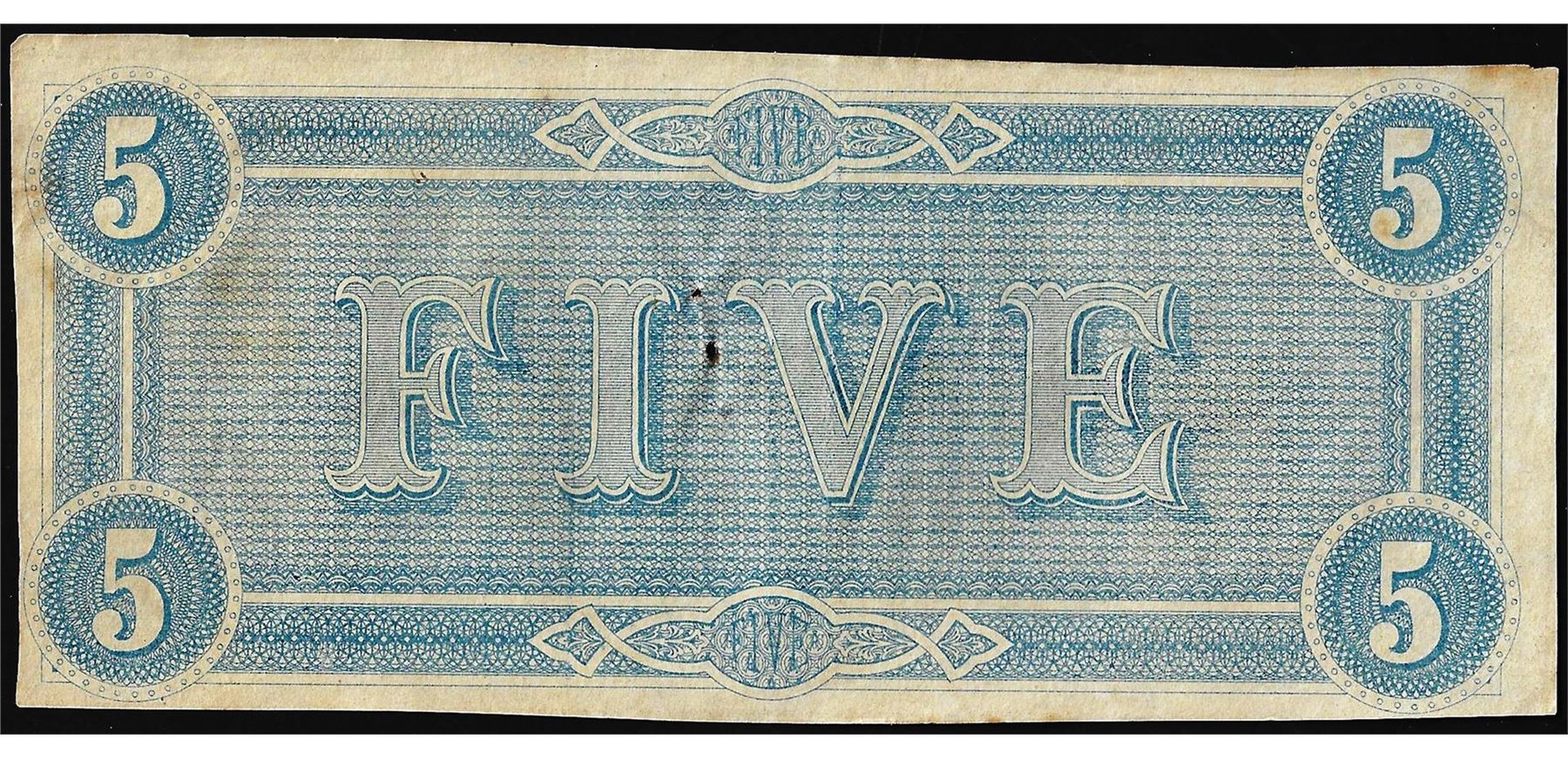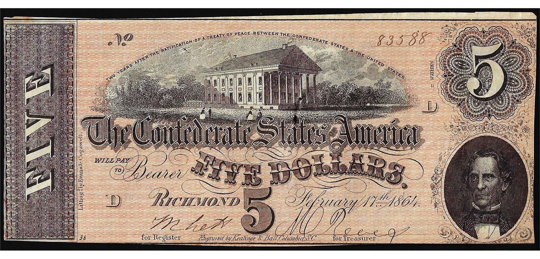 One 1864 $5 Confederate States of America Note.