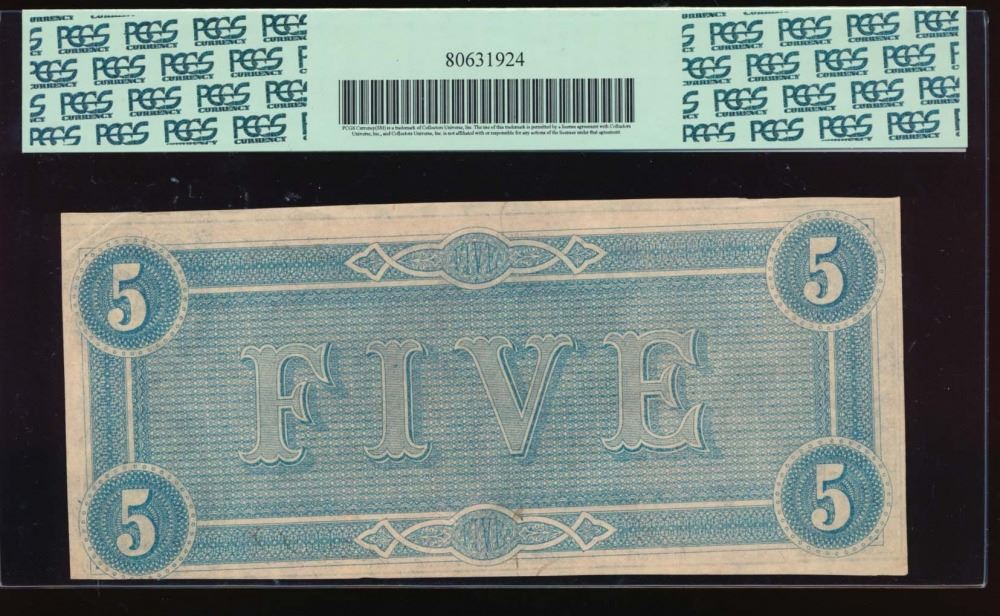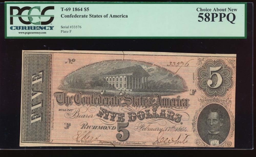 One 1864 $5 Confederate States of American Note PCGS 58PPQ.