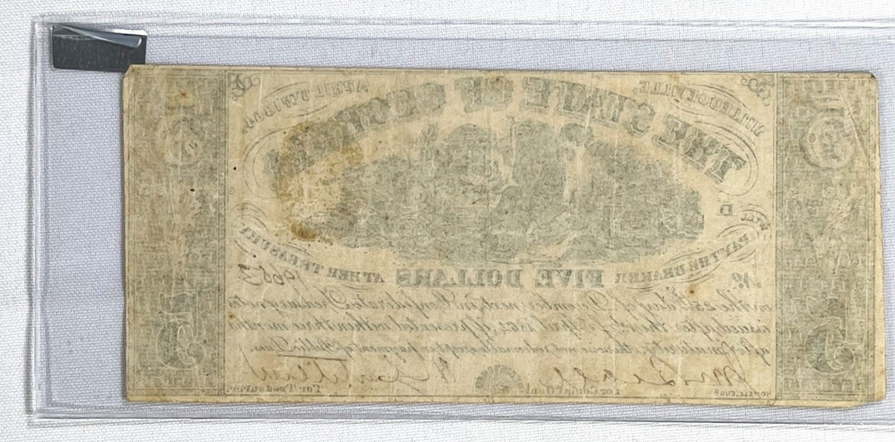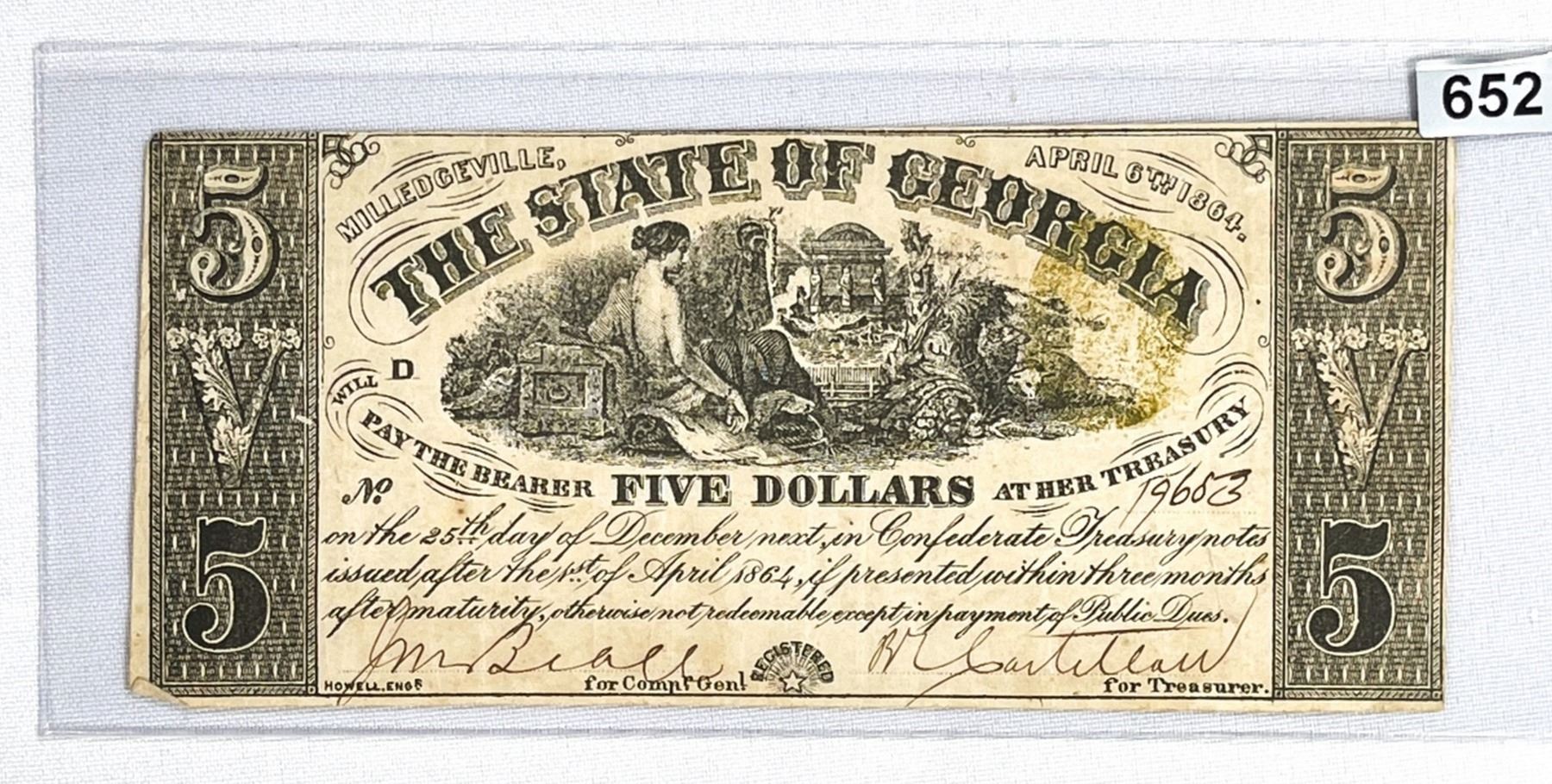 1864 $5 Dollar Milledgeville GA Note