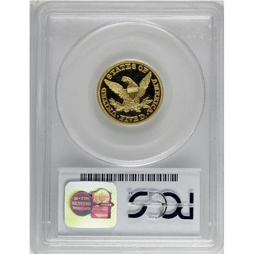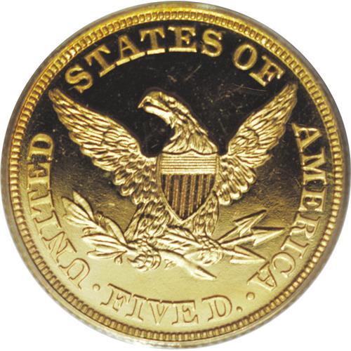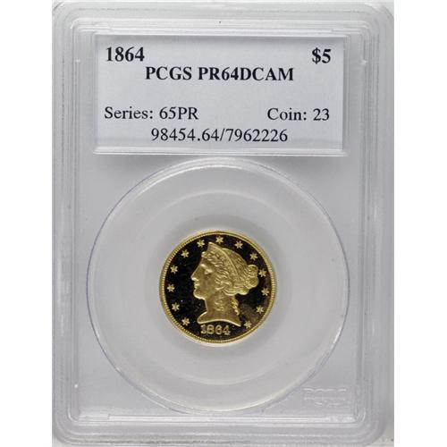 <B>1864 $5 PR64 Deep Cameo PCGS.</B></I> The 1864 proof five has a mintage of 50 pieces. While this is a tiny output, the survivorship is higher than other dates from the era and as such it is considered the most "common" date as a proof in the No Motto series. In spite of the multiple resubmissions that have artificially inflated the population data, with more than 30 pieces certified today, probably only 12-15 individual proofs are actually still extant. This number includes three pieces that are held in institutional collections--two in the Smithsonian and one in the ANS. Because of the artificially high numbers seen at the services, it is also difficult to discern just how many coins are known in this and better grades. That being said, at least several (whatever number that is) are known finer than this piece.<BR> Proofs of this date all show a common diagnostic: a die scratch (or is it a short die break?) below Liberty's ear. According to Breen (1988) this diagnostic was observed on the Auction '80 and the Clapp/Eliasberg coins.<BR> This is a lovely example and one that also is numismatically interesting. A streak of slight granularity is seen in the lower obverse field that extends to the rim and then runs between the denticles and stars 10-13. Otherwise, the surfaces display the deeply reflective fields one would expect from a proof gold coin. Also, given the limited mintage of this date, the devices are heavily frosted and present a strong gold-on-black contrast on both obverse and reverse. A few small, stray marks keep the coin from a full Gem classification, but this is a singularly impressive No Motto proof five that will undoubtedly be included in a high grade proof type set.<BR><BR><b>Shipping:</b> Coin/Currency (<a target="_blank" href="http://www.heritageauctions.com/common/shipping.php">view shipping information</a>)