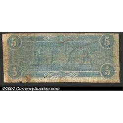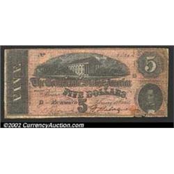 1864 $5 State Capitol at Richmond, VA in center; C.G. Memminger on right, T-69, VF. The bottom edge is slightly brittle and a couple of edge splits are present.