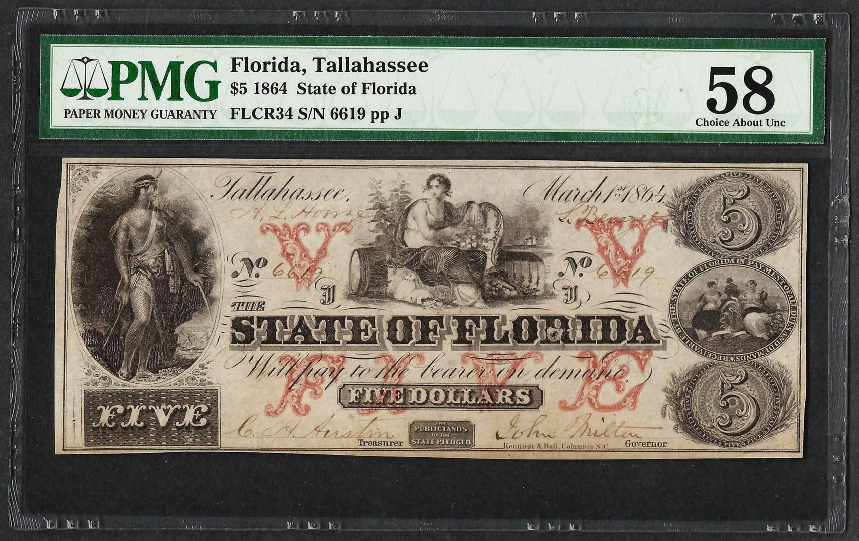 One 1864 $5 State of Florida Obsolete Note PMG Choice About Uncirculated 58. PMG Certified.
