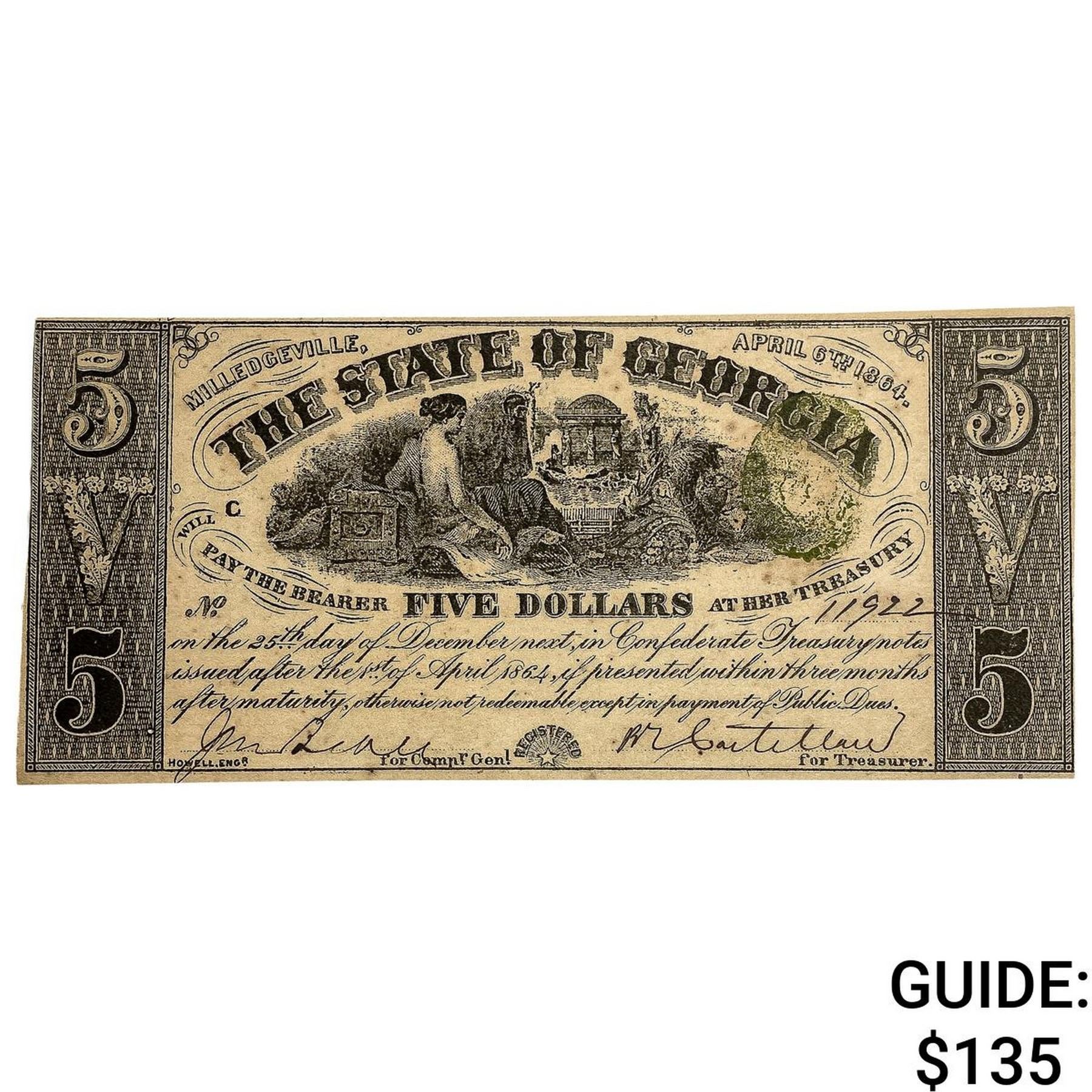 1864 $5 State of Georgia Note-Milledgeville