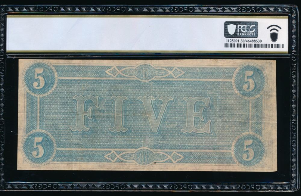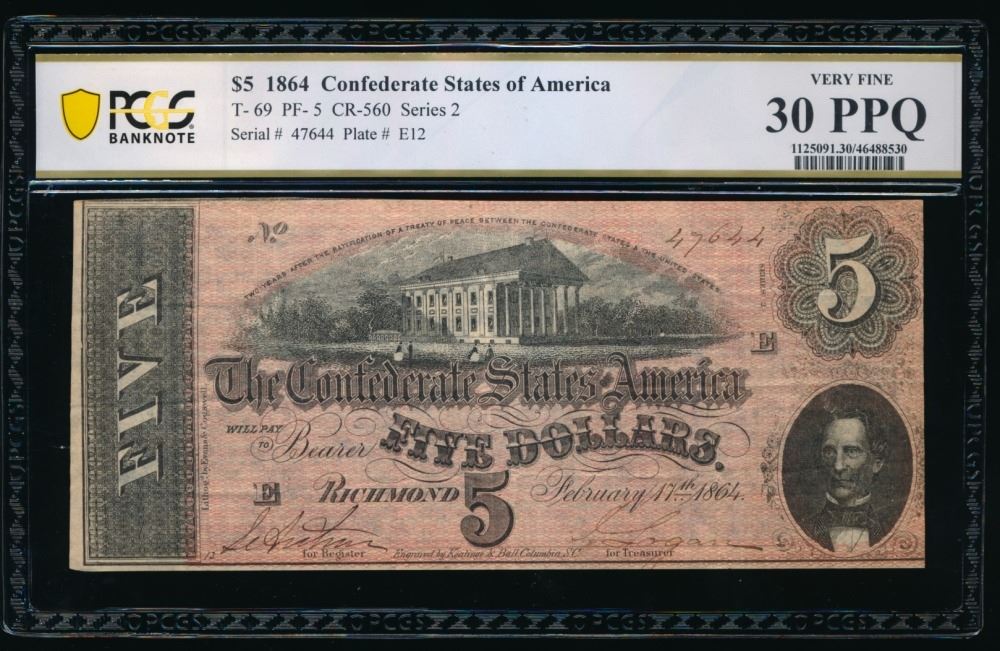 One 1864 $5 T-69 Confederate PCGS 30PPQ.