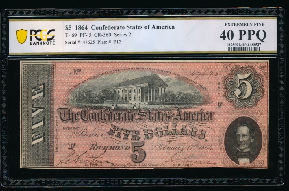 One 1864 $5 T-69 Confederate PCGS 40PPQ.