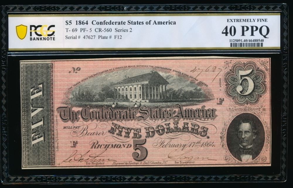One 1864 $5 T-69 Confederate PCGS 40PPQ.