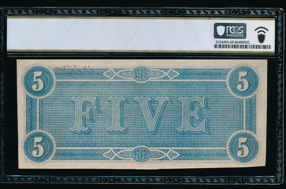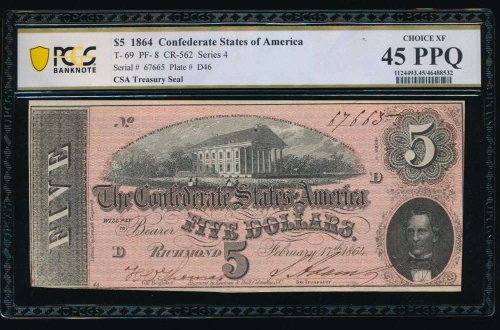 One 1864 $5 T-69 Confederate PCGS 45PPQ.