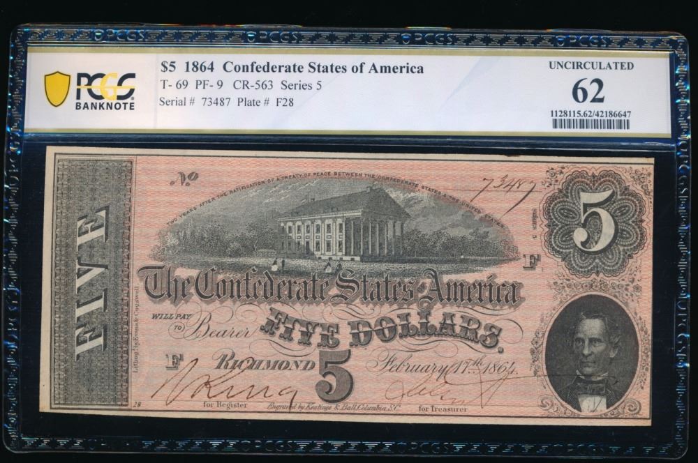 One 1864 $5 T-69 Confederate PCGS 62.