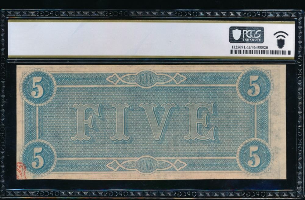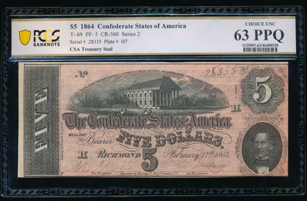 One 1864 $5 T-69 Confederate PCGS 63PPQ.