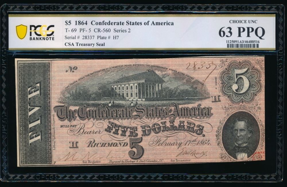 One 1864 $5 T-69 Confederate PCGS 63PPQ.